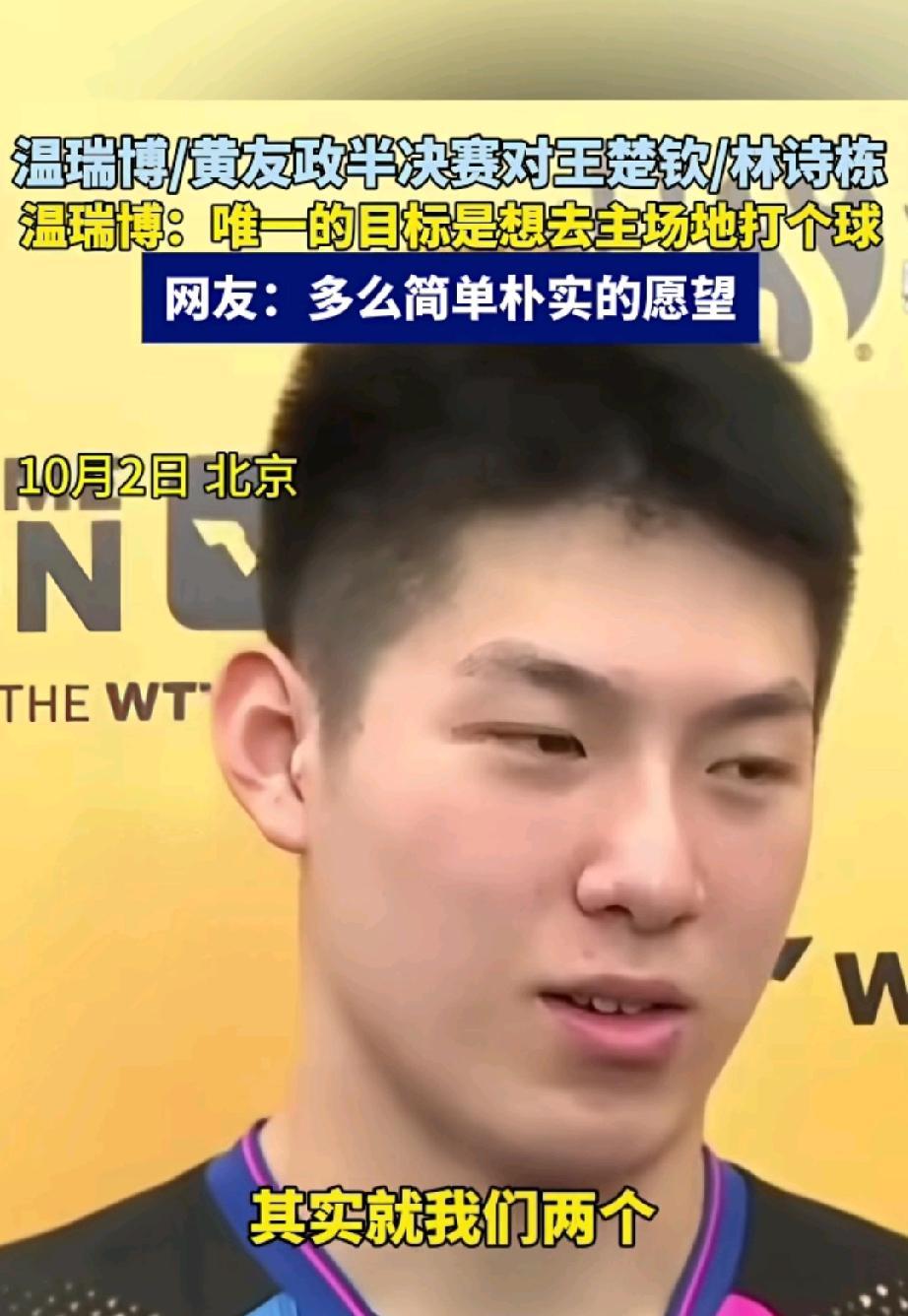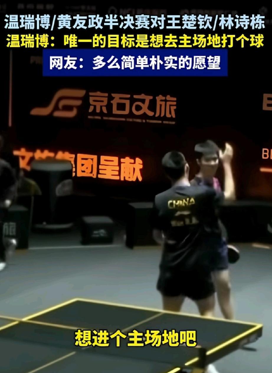 小将温瑞博和黄友政的愿望就是这么朴实:唯一的想法和目标就是想进主场地打球!他们还没有进主场地打过球呢。 太可爱了,这两个小将,一路过关斩将,挺进半决赛,接下来将和队友王楚钦和林诗栋组合决战。 他俩能打到现在这个局面,输赢都不重要的,重要的是历经了大赛历练,各个方面都得到了提高。不管是技战术方面,还是现场适应能力,现场应变能力,现场的心理承受能力,都有有质的飞跃。 其实温瑞博这么说,也是本人高情商体现。同时也是对于对手的尊重和敬仰。 如今他们实现了这个愿望。现在正在和对手较量呢。没想到,他们先输一局,然后又扳回一局。 面对林诗栋王楚钦,能赢下一局,已经非常难得了!