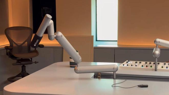 值得注意的是,录音室内的所有麦克风都是定制款式,机身上印有“AppleMusic”标志,同时麦克风的机械臂调节支架长得很像“台灯电脑”iMacG4。紧挨着录音室的是导播室,配有多台显示器和切换器,桌子看起来、摸起来都很像AppleStore直营店“同款”,可以将各种设备隐藏在桌子中间。