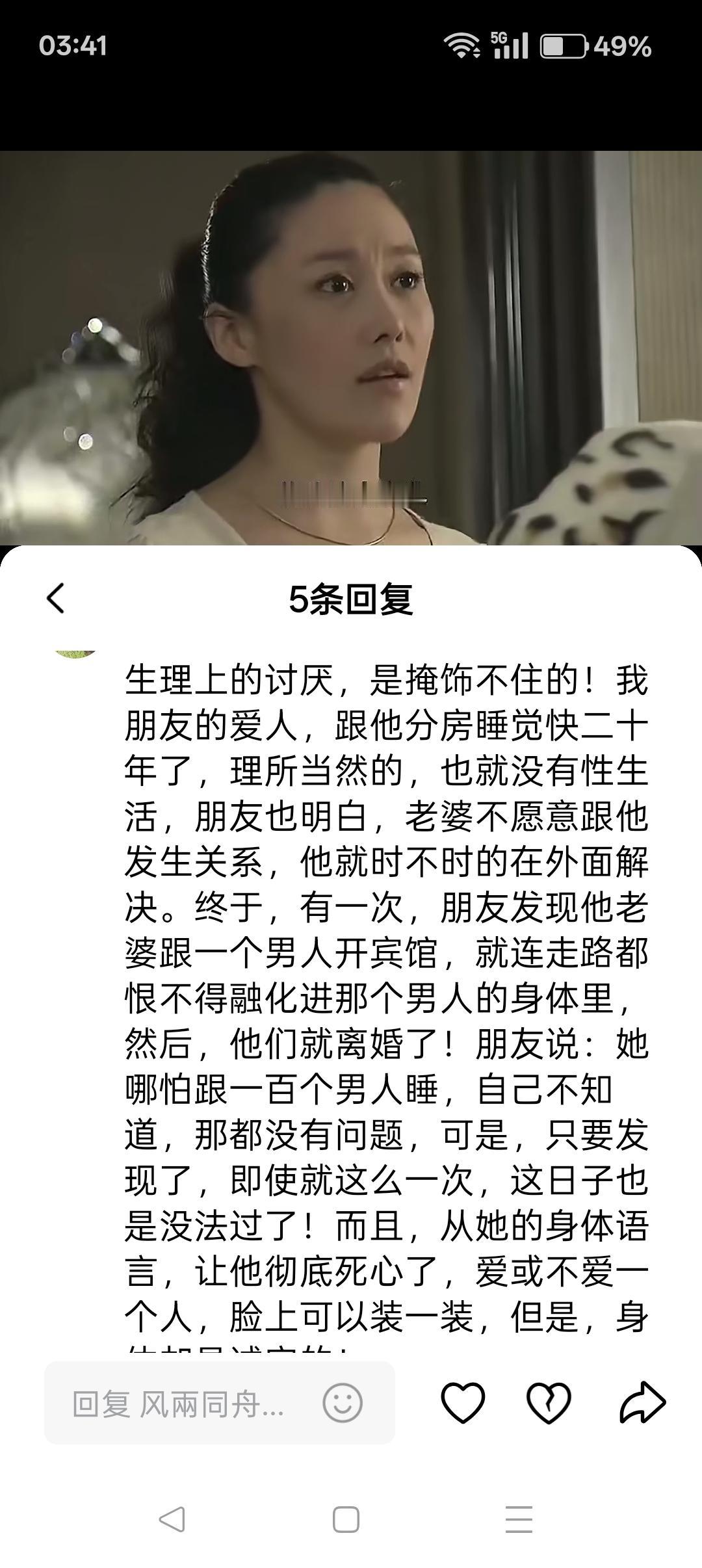 生理上的讨厌,是掩饰不住的! 我朋友的爱人,跟他分房睡觉快二十年了,理所当然的,也就没有性生活,朋友也明白,老婆不愿意跟他发生关系,他就时不时的在外面解决。 终于,有一次,朋友发现他老婆跟一个男人开宾馆,就连走路都恨不得融化进那个男人的身体里,然后,他们就离婚了! 朋友说:她哪怕跟一百个男人睡,自己不知道,那都没有问题,可是,只要发现了,即使就这么一次,这日子也是没法过了!而且,从她的身体语言,让他彻底死心了,爱或不爱一个人,脸上可以装一装,但是,身体却是诚实的! (以上文案是抄录某网友的。)