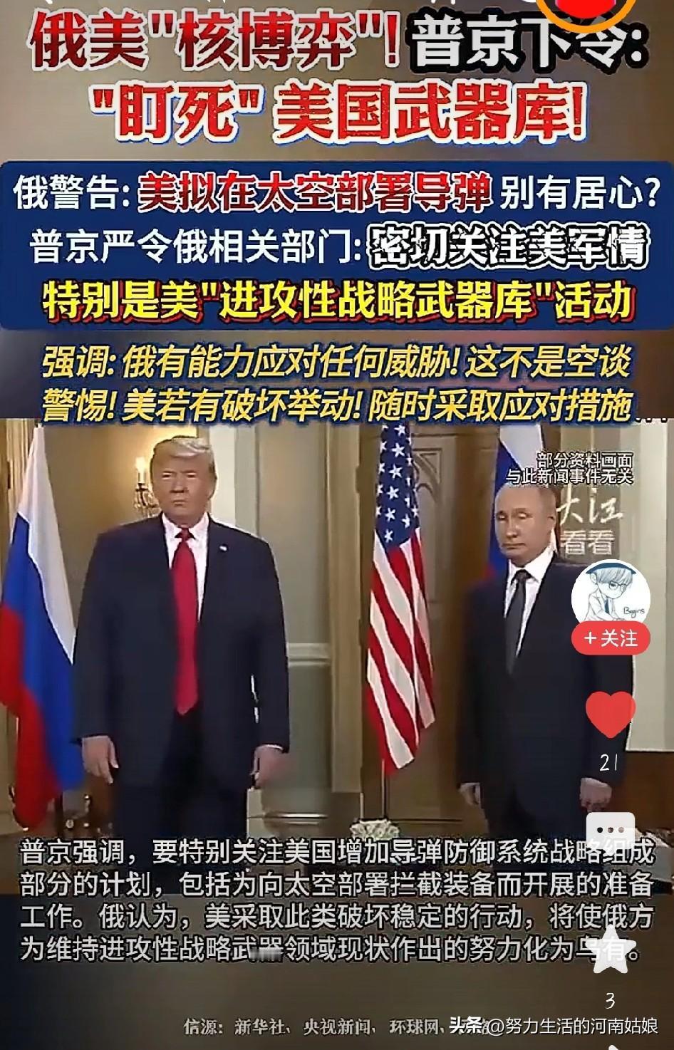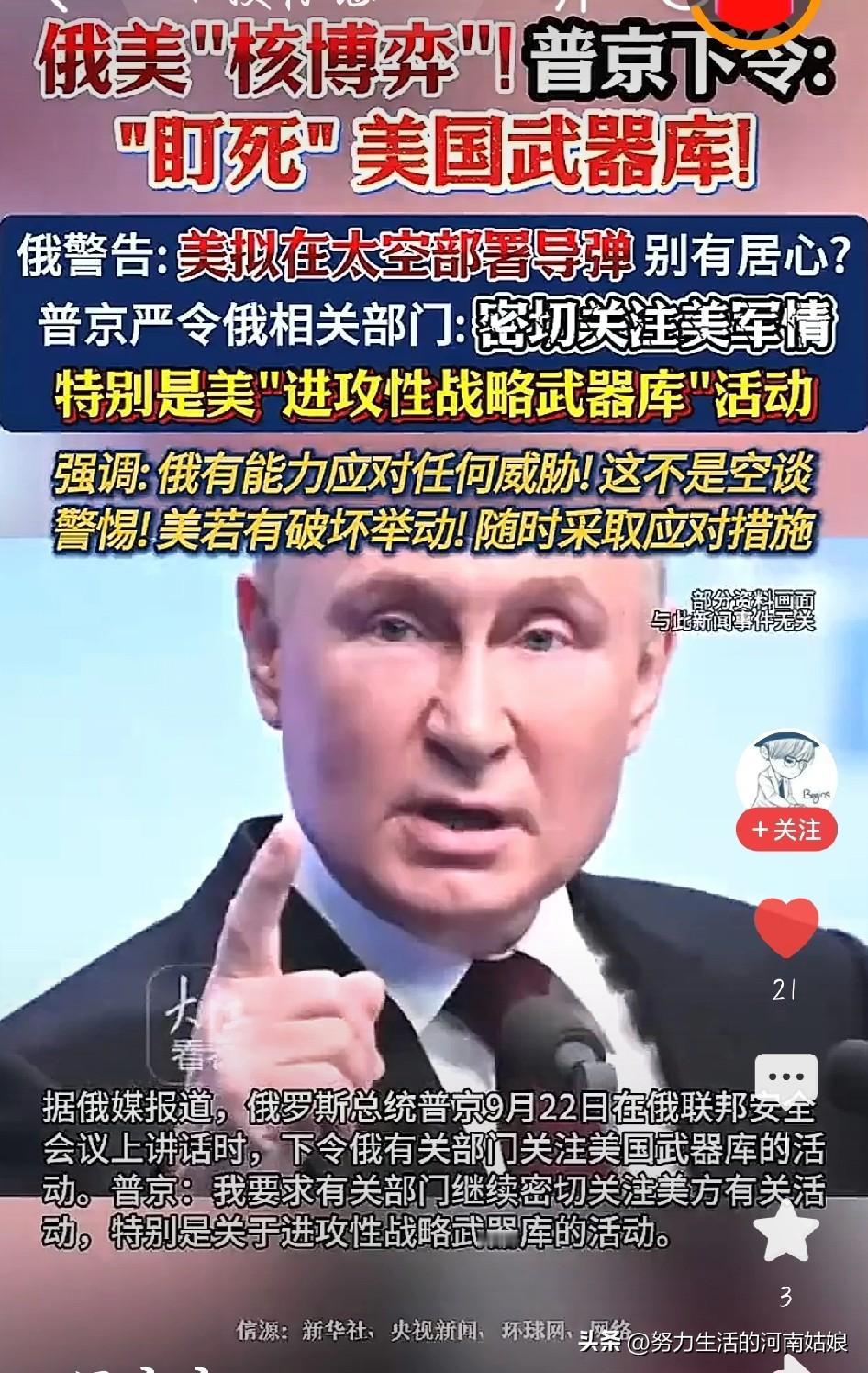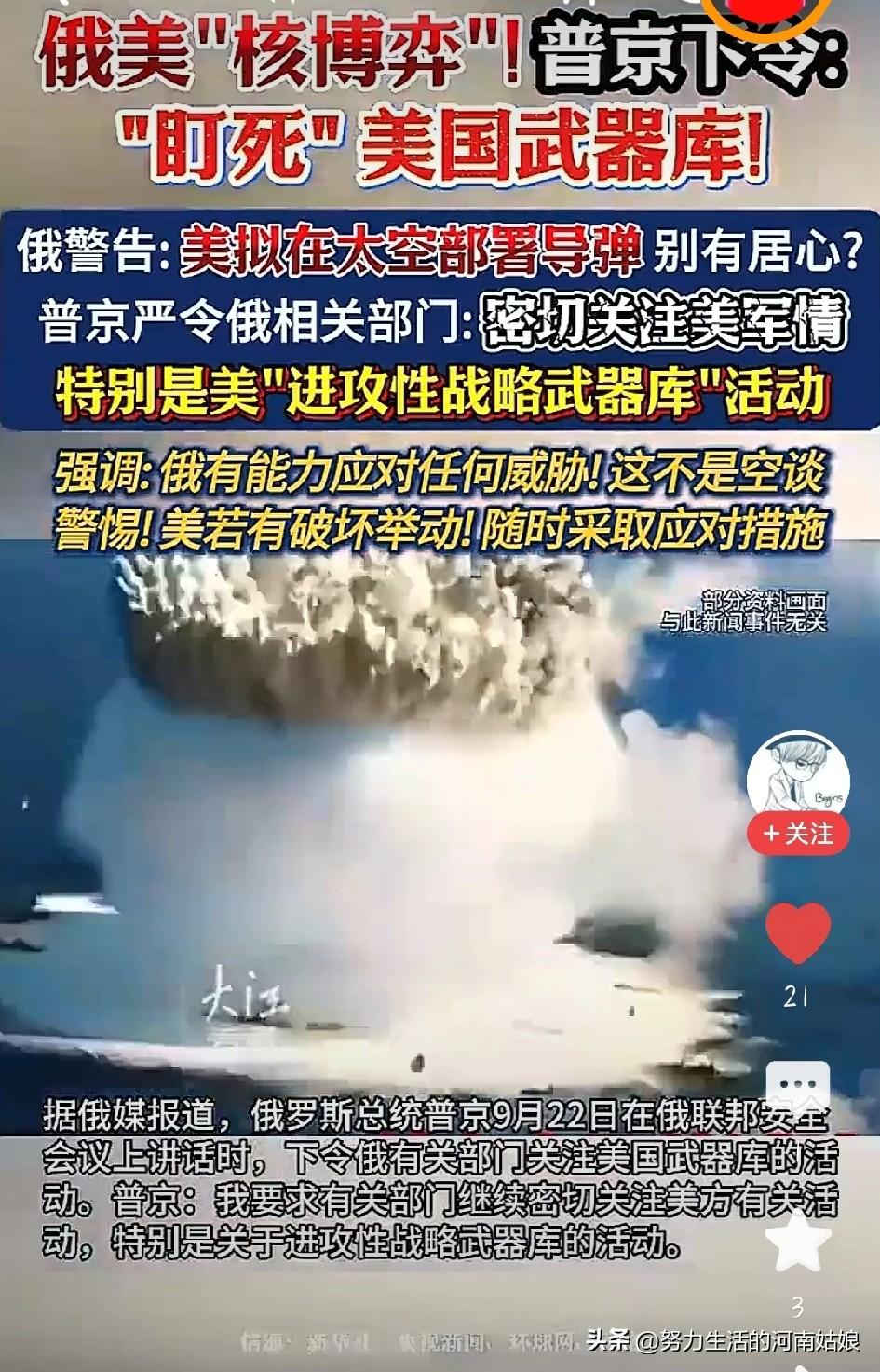 普京放话:你敢试核武,我就跟着来! 普京这话说得够直接:有个核大国在偷偷准备核试验,它敢先炸,俄罗斯立马跟上。 明眼人都知道说的是美国,之前美国就在内华达州搞亚临界核试验,还升级核试验场设。更关键的是,俄新地岛的核试验场早就准备好了,设施、人员随时能启动,就等命令。 这可不是空话,俄罗斯核武现代化水平本就领先,还有“榛树”这类新导弹撑底气。说白了就是互相盯着,你不守规矩掀桌子,我也绝不手软。核军备这根弦,这下又绷得更紧了。普京大帝 普京总统 核武问题 核武器俄罗斯 核武使用 俄修改核政策 普京:若某核大国进行核试验俄将跟进 图片截图于网络