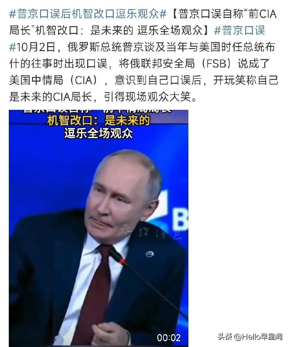 不要以为普京口误是什么好玩的! 当一个政治家出现口误时,说明他的身体、尤其是思维确实开始老化了,比如拜登,比如特朗普,比如现在的普京: 这是普京执政以来出现的最大一次口误,他在大白天的讲话现场,竟然将俄罗斯安全局说成了美国中央情报局。 也就是说,俄罗斯应该做出新的选择了,应该提拔一个具有新思维新战略的新总统了,由此促成俄罗斯的有新动能与新希望。