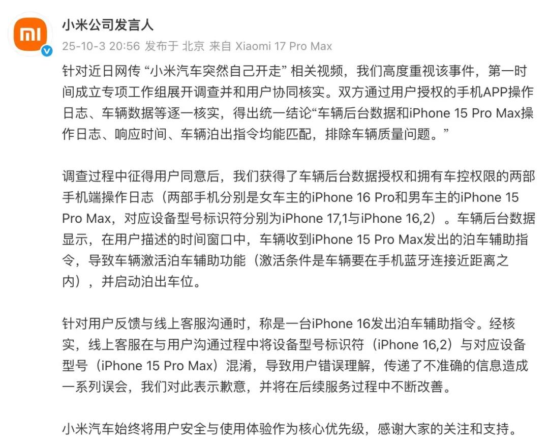 针对近日网络流传“小米汽车突然自己开走”相关视频,小米公司高度重视该事件,第一时间成立专项工作组展开调查并和用户协同核实。双方通过用户授权的手机APP操作日志、车辆数据等逐一核实,得出统一结论“车辆后台数据和iPhone15ProMax操作日志、响应时间、车辆泊出指令均能匹配,排除车辆质量问题。”