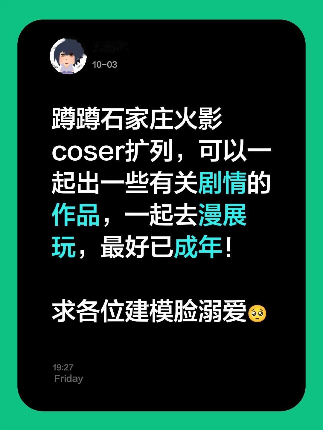 求🥹因为本人太社恐了….蹲蹲石家庄火影coser扩列,可以一起出一些有关剧情的作品,一起去漫展玩,最好已成年! 求各位建模脸溺爱🥺