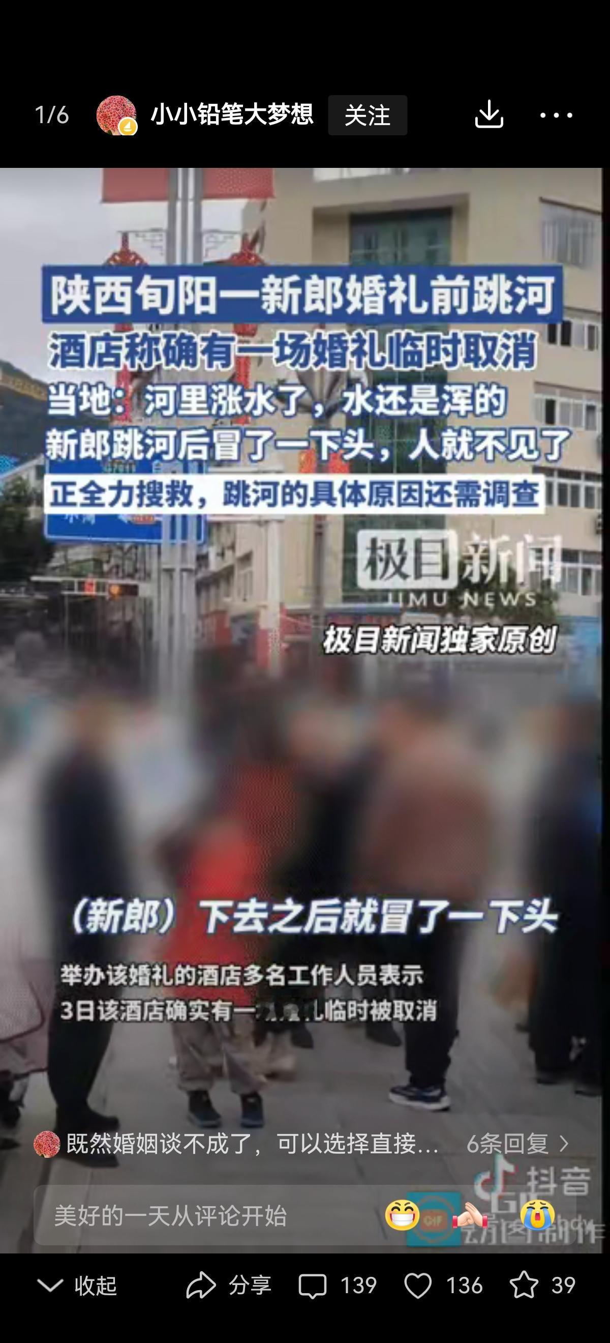 喜事变丧事,还有两分钟婚车到酒店,新郎却选择跳河? 究其原因,竟是因为20000元的下车礼。 现在的婚礼风俗竟然随着环境的变化而发生天翻地覆,婚礼已经不是以前的为了终生大事而注重的婚礼,而是变成了“谈生意”的大事。 娶媳妇,嫁女儿,不是为了儿女以后的幸福所想,而是能不能像做生意一样,“买方”得以“卖方”的要求为根本,满足不了条件,“卖方”会以“不上车”,“不下车”以逼“买方”必须满足而达到要求,却从不考虑,如果这样进行,婚礼还能不能继续进行,婚后的生活会如何? 怪不得,现在为什么很多人都不愿意结婚了。想想,这种风气有点悲哀!