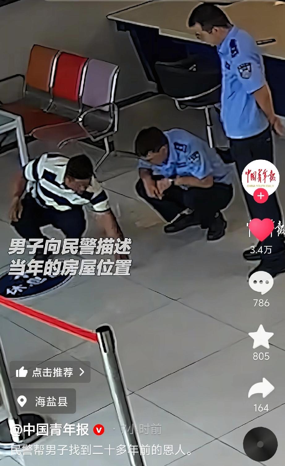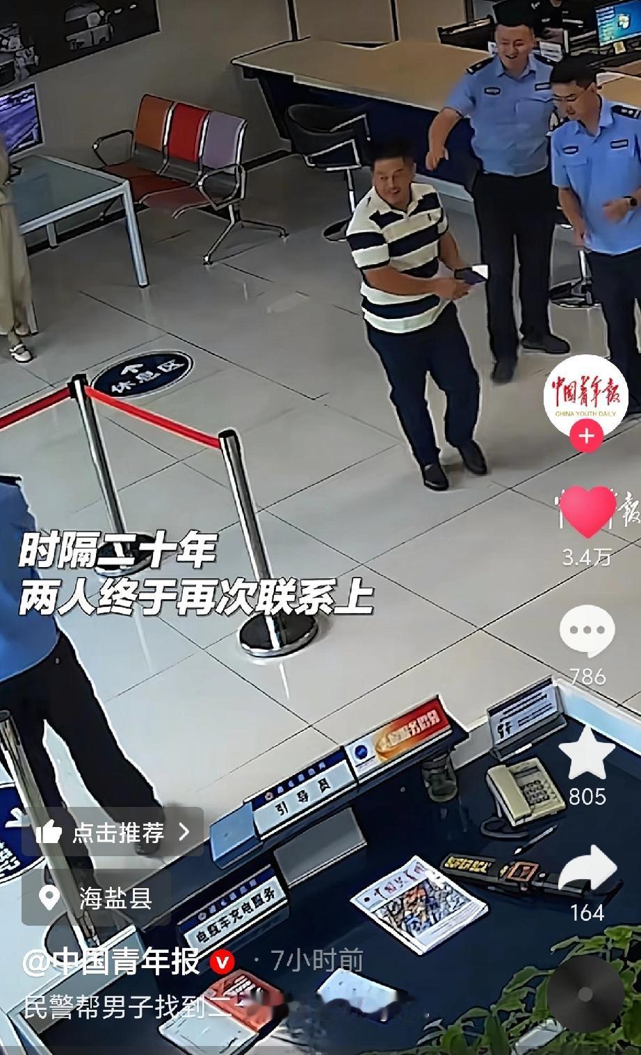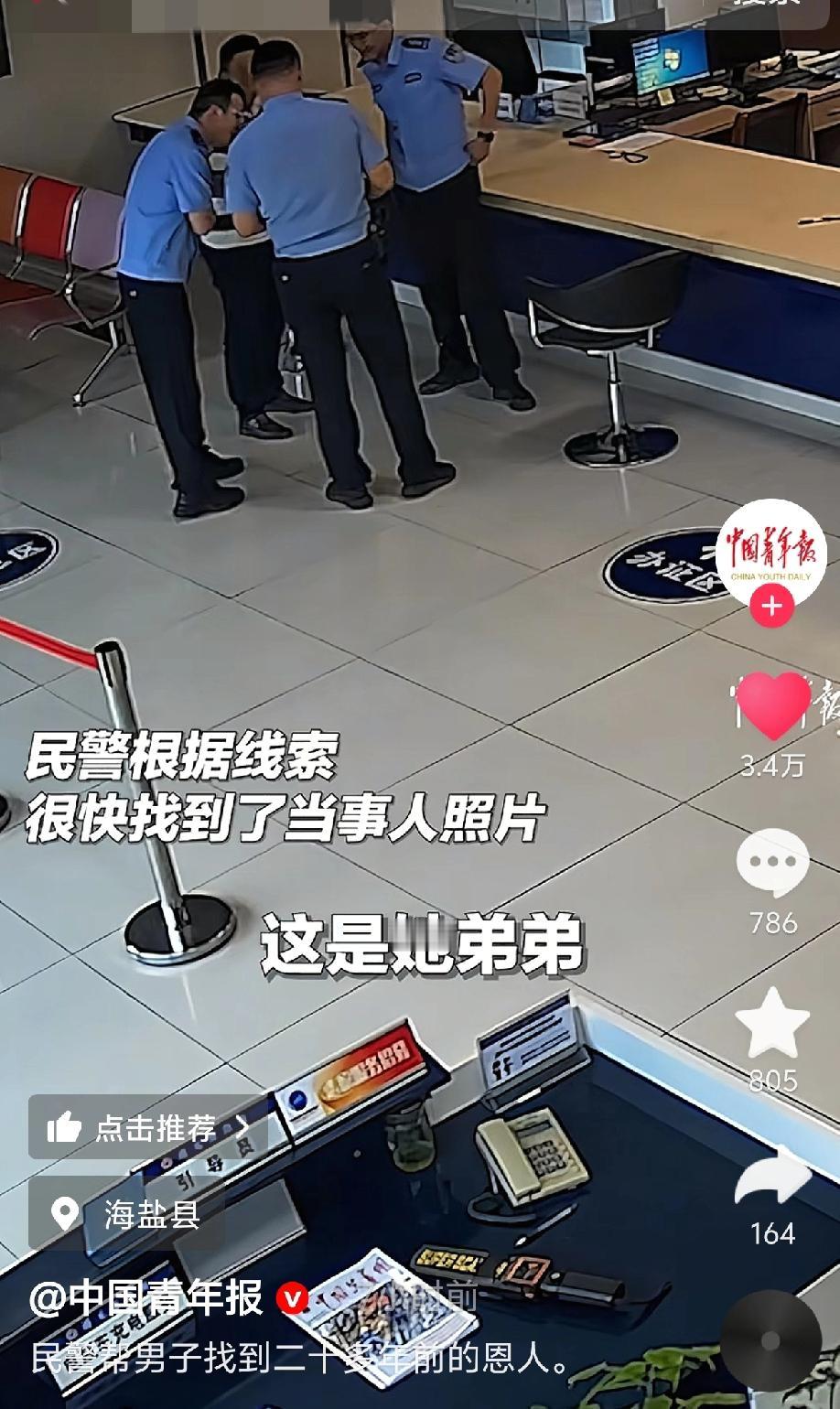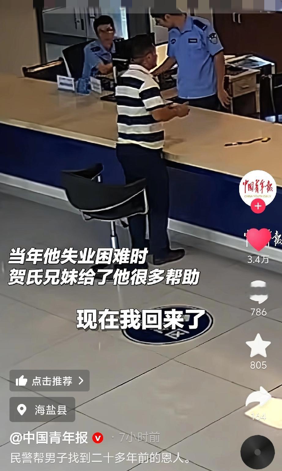 “太意外了!”浙江海盐县派出所来了一名黄姓男子,以为他是来报警的。然而令民警们没想到的是,黄先生是来找人的。由于时间久远,恩人搬家,已联系不上,这才把黄先生急得跑进了派出所。 不得不说黄先生这运气也太好了吧!他向民警介绍,2005年在通元这里当时失业困难,是贺氏兄妹给了他很多帮助。现在生活条件好了,想感谢兄妹二人,可是联系不上了,只能请民警帮助寻找。万万没想到,还真让民警给联系上了。 网友热议, 这个事情最让人欣慰的地方不是这个大哥千里寻阿姨,而是值班民警能耐心听他讲并帮他实现了愿望,这才是最难能可贵的,为人民服务不是说说而已! “滴水之恩定当涌泉相报”在此具象化了,这就是人间自有真情在! 你困难的时候,遇到过别人帮助吗? 对此,你怎么看?