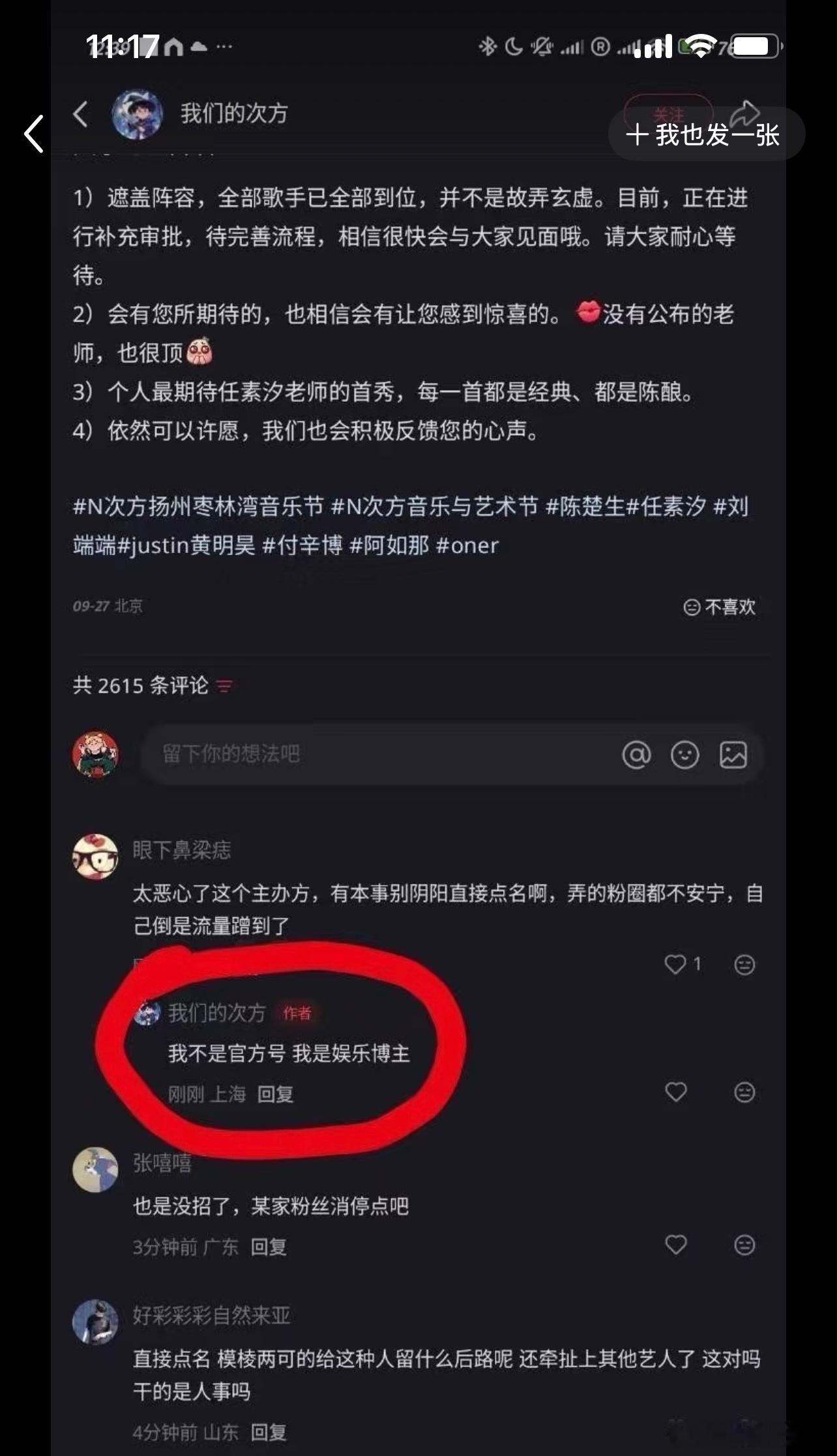 我们的次方不是枣林湾音乐节的主办方?亲口说的只是一个娱乐博主,啊,一个博主能知道这么多的吗?