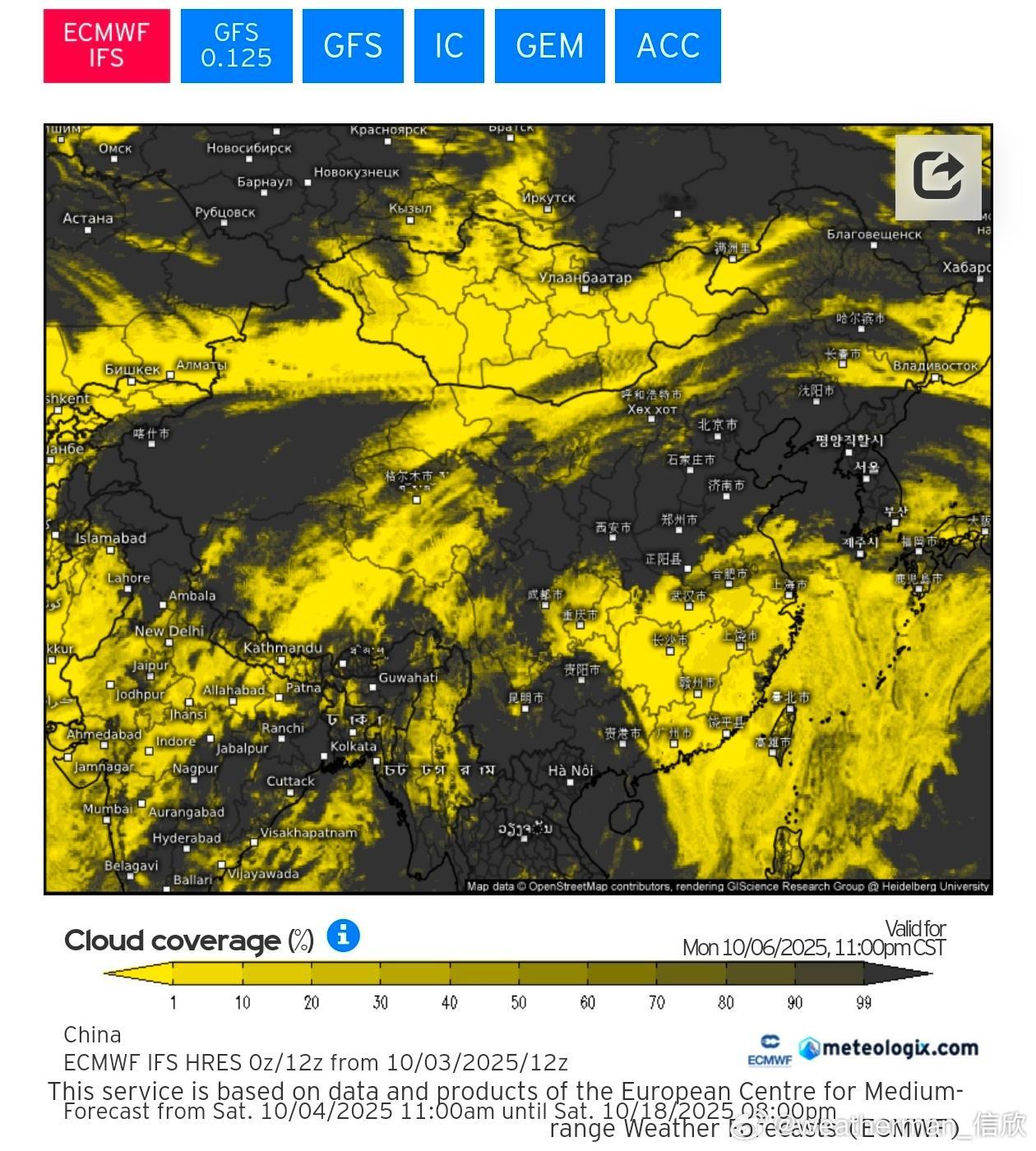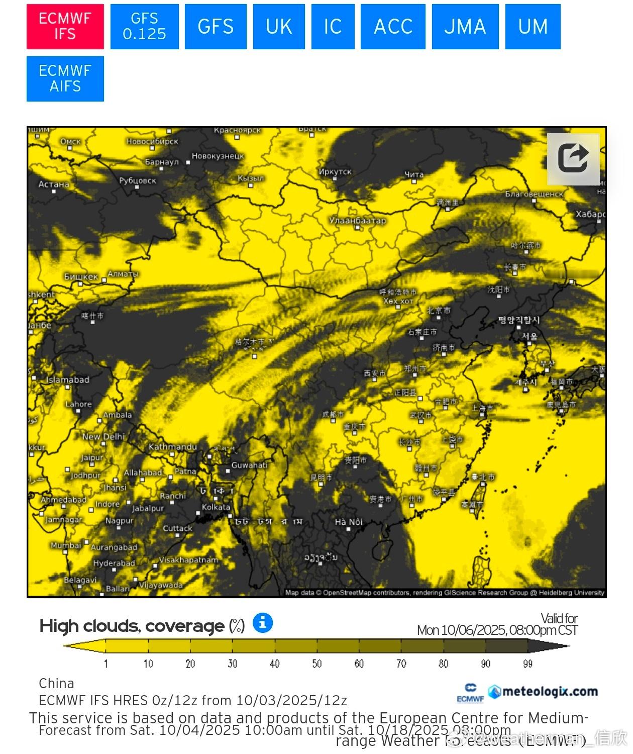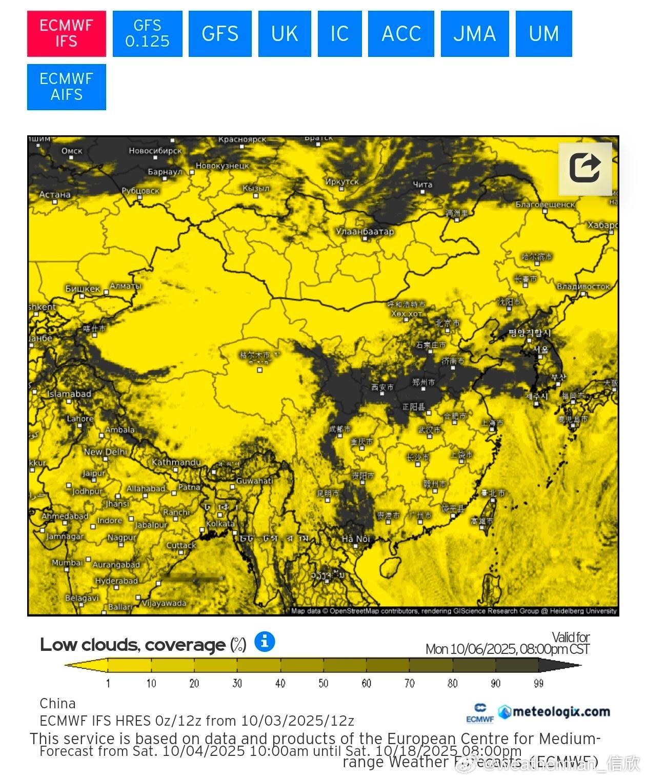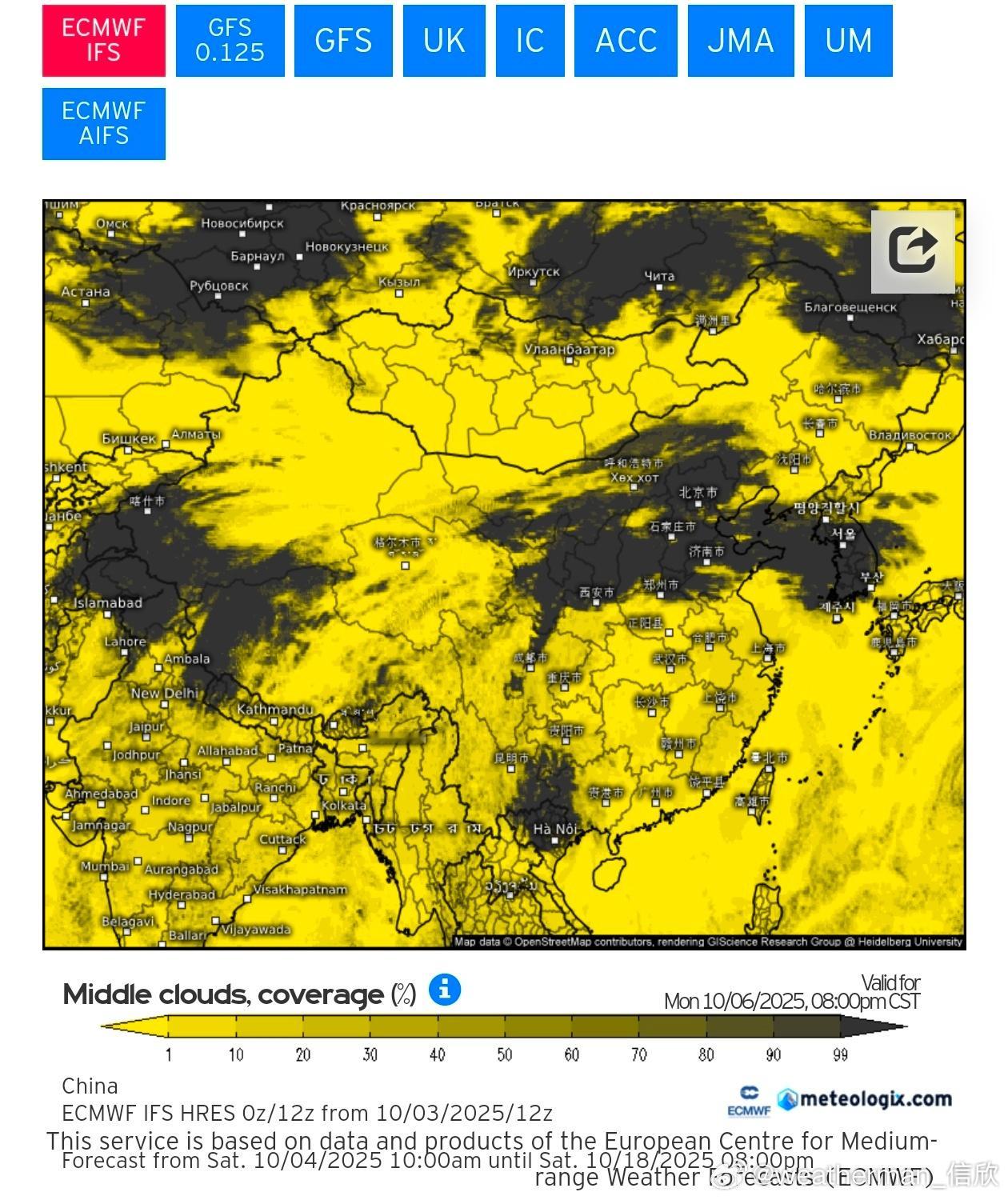 图1-4为6日20时总云量、低云量、中云量、高云量预报。图6-9为6日23时云量预报(备注,该系列云量图的地图边界非我国标准地图)。总云量图上亮黄区为晴空,利于赏月。如果低云量或中云量为灰黑色有云遮挡,无法赏月。如果只有高云,且较薄能透光就是彩云追月。