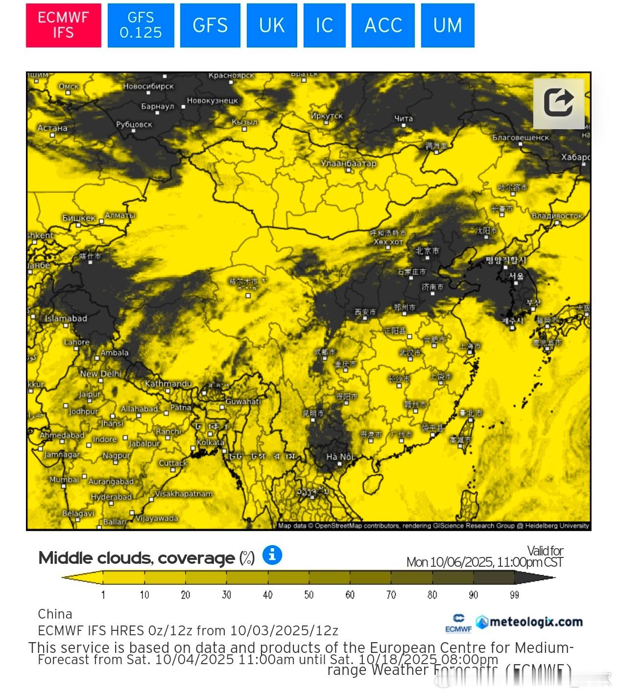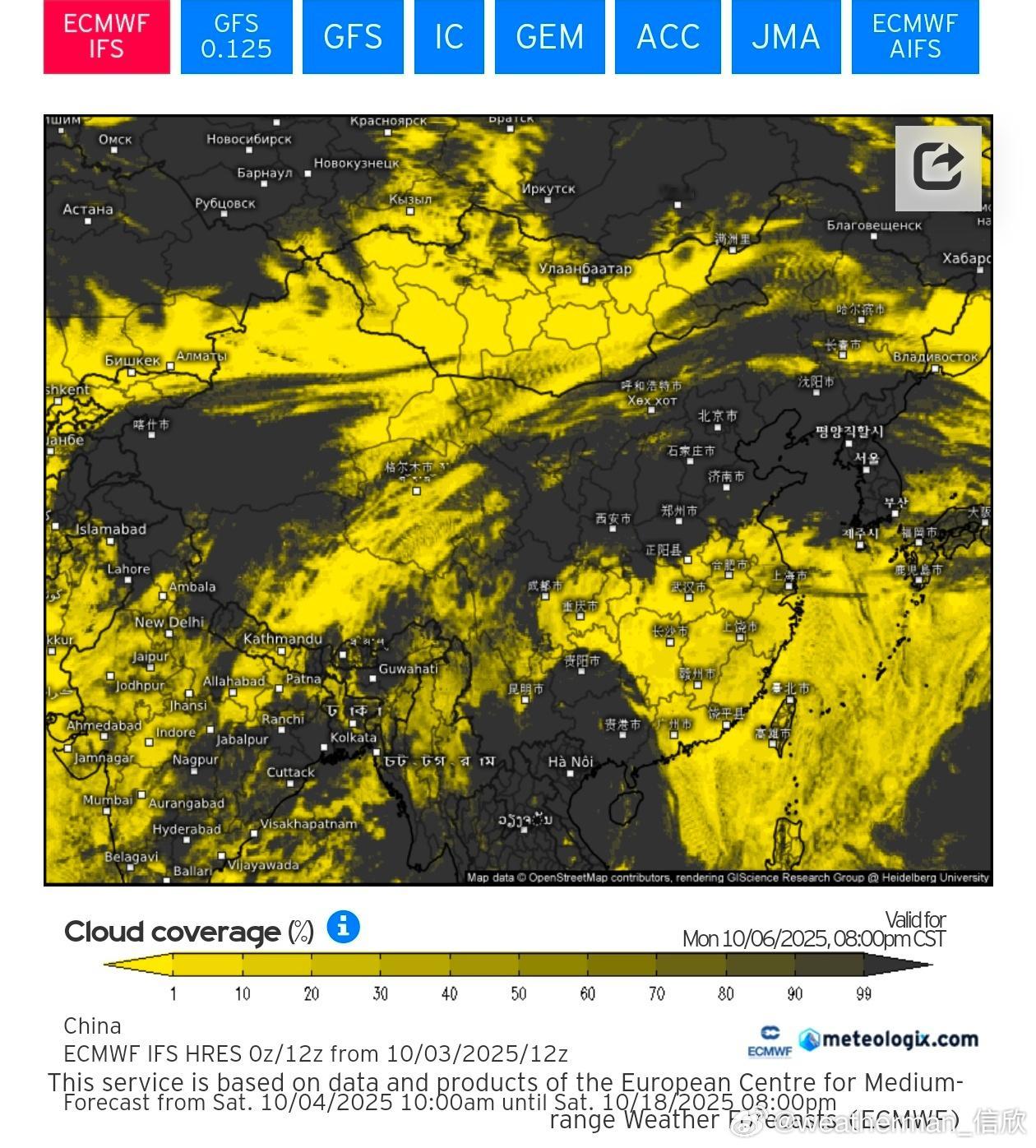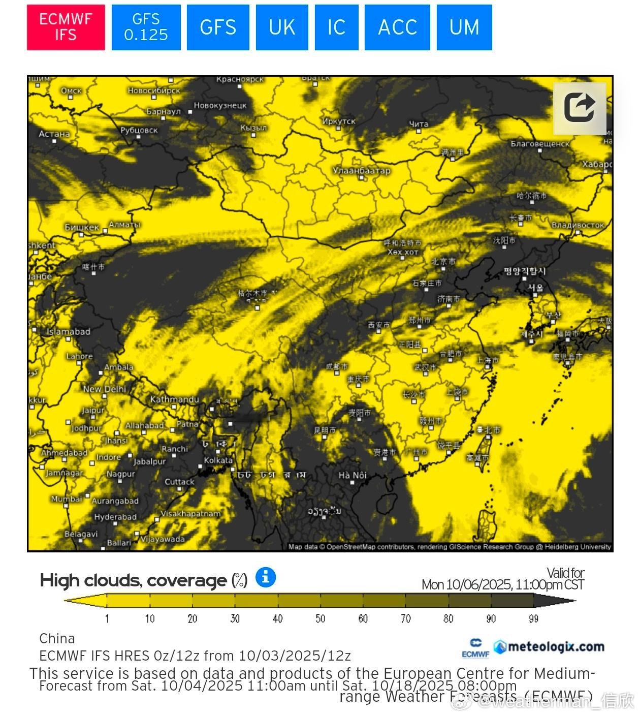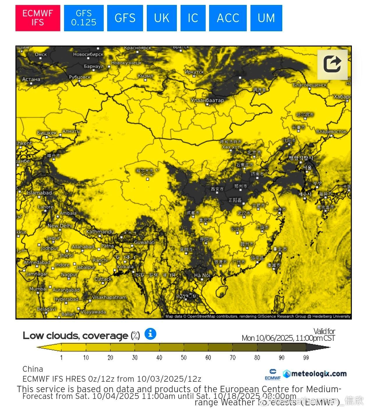 图1-4为6日20时总云量、低云量、中云量、高云量预报。图6-9为6日23时云量预报(备注,该系列云量图的地图边界非我国标准地图)。总云量图上亮黄区为晴空,利于赏月。如果低云量或中云量为灰黑色有云遮挡,无法赏月。如果只有高云,且较薄能透光就是彩云追月。