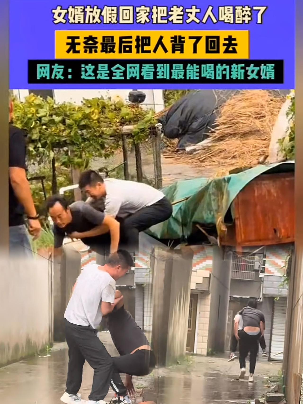 笑不活了! 江苏这女婿把老丈人喝趴,下雨天背人回家,结果网友集体晒‘战绩’——原来天底下老丈人和女婿的酒局,都是一场‘面子’与‘酒量’的较量! 视频里女婿背着醉醺醺的老丈人,在风雨里踉跄前行,网友却纷纷翻出自己的“光辉历史”:有人一挑三放倒全家,有人被老丈人干趴后遭全家嘲笑,还有人第一次上门就喝倒半桌亲戚,结果从此再没酒喝。 看来这酒桌上的“较量”,早成了女婿和老丈人之间的“传统项目”。 不过说真的,酒量再好也别贪杯,喝醉了难受不说,还伤身体。 假期团聚本就该轻松点,喝两杯尽尽兴就行,何必非要争个“你输我赢”?毕竟,把老丈人喝趴容易,可要是喝出个好歹,那可就得不偿失了。 你身边有这种“女婿VS老丈人”的酒局趣事吗?评论区聊聊,你更支持点到为止还是一醉方休?