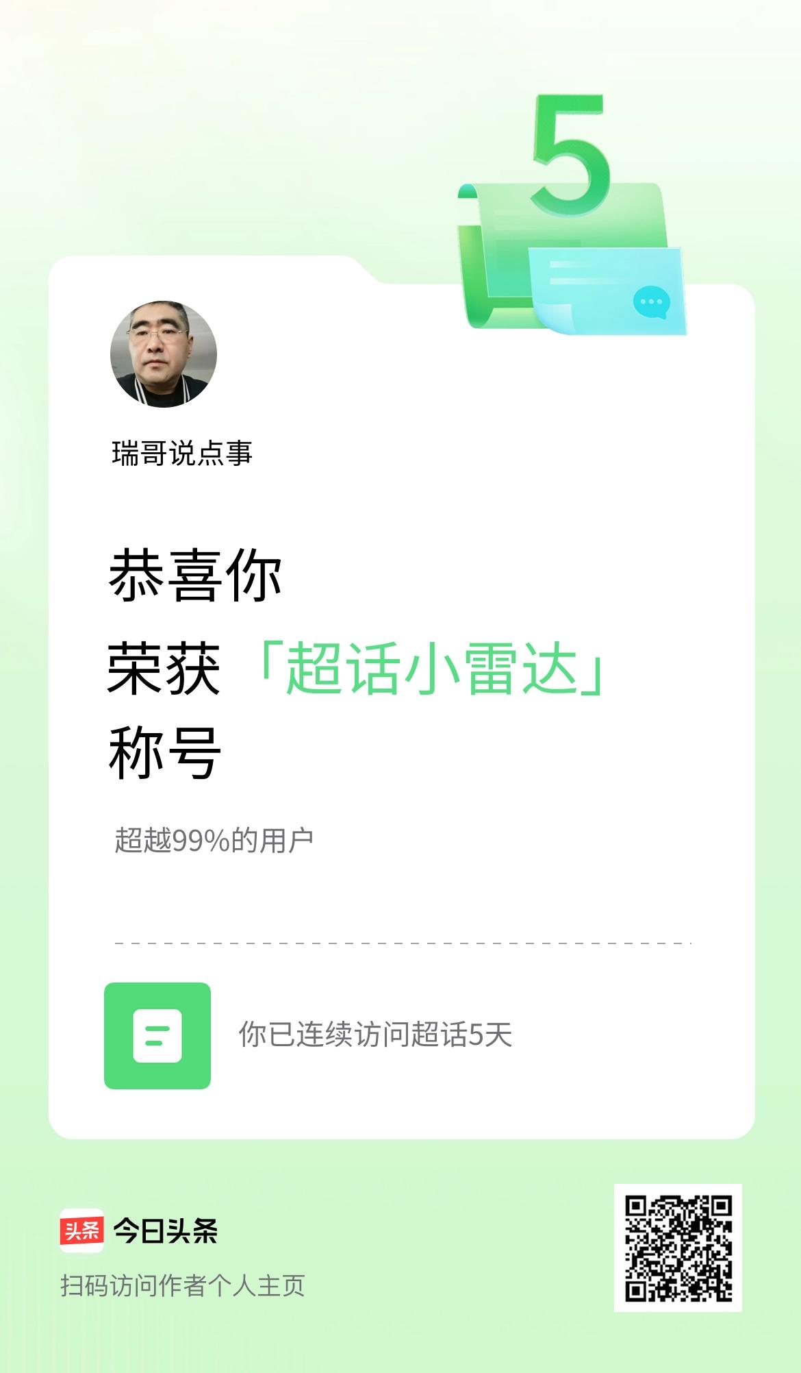 我在头条连续访问超话5天,获得“超话小雷达“称号,你也快来超话看看吧~