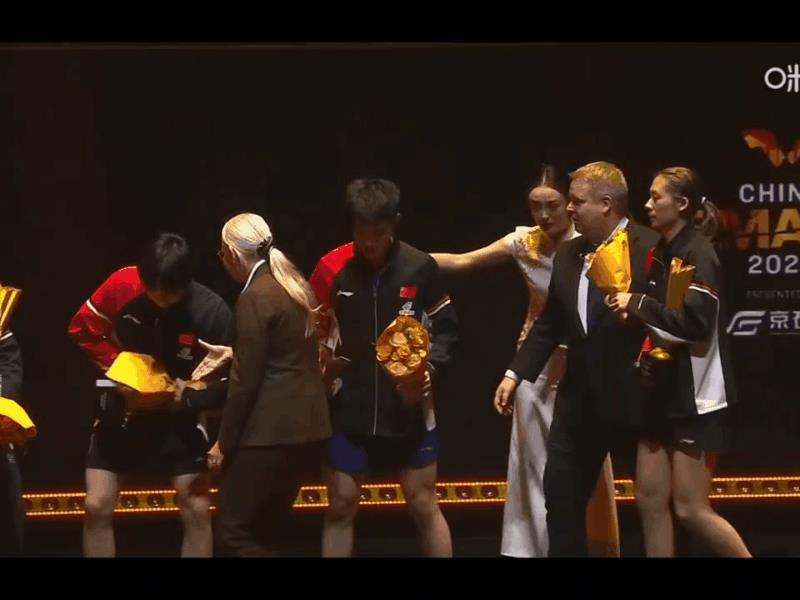 哈哈,大头手忙脚乱的腾出手来和嘉宾握手! 奖杯实在太重了,捧花也没法拿,还要腾出手来握手,真的好难! 头哥怎么这么多洋相,此刻显的莎莎好稳重[大笑][大笑][大笑] 在莎莎的对比下,头头真的是搞笑又可爱!!