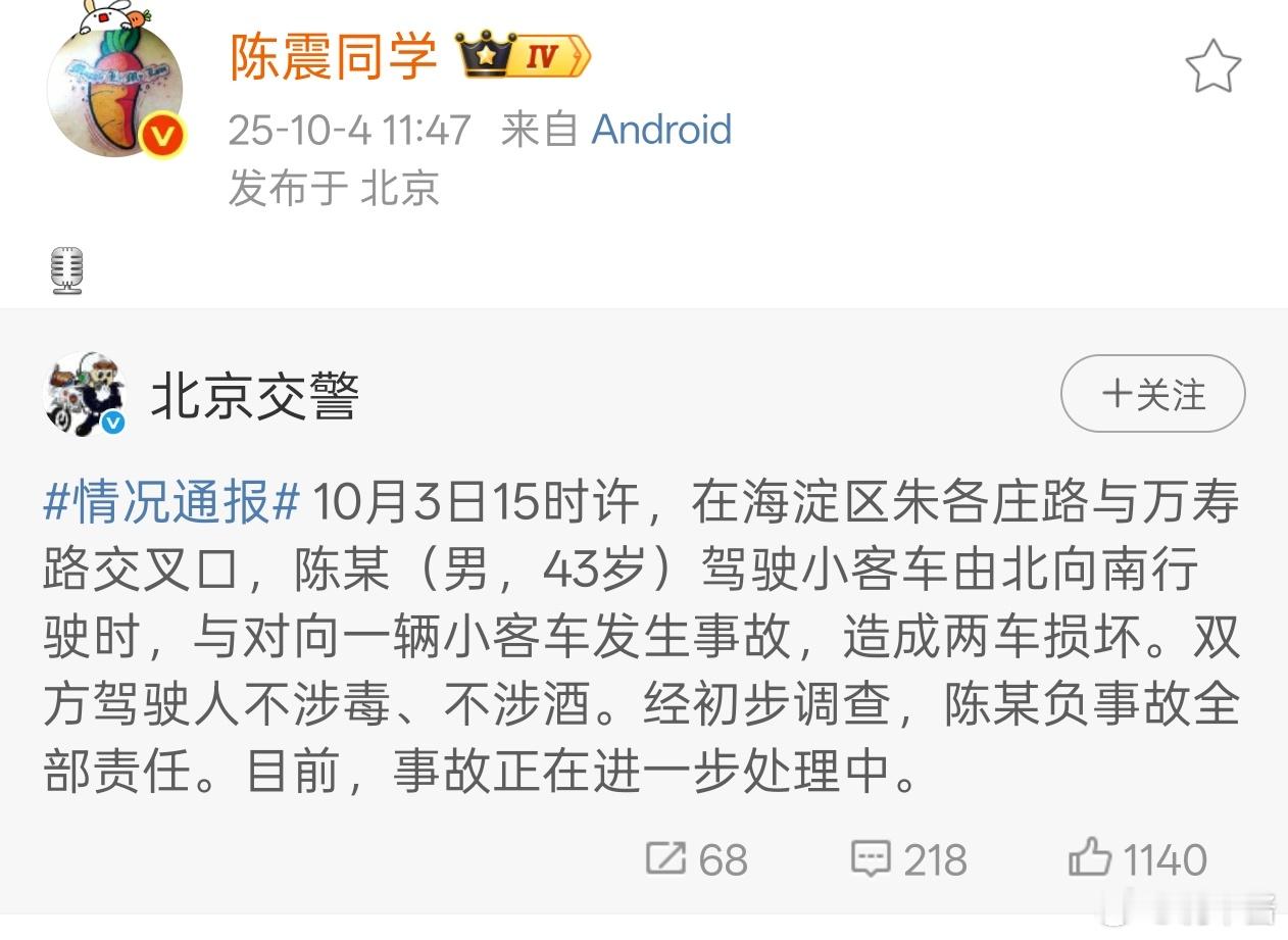 陈震妻子回应官方的通报也出来了,陈震全责,事故正在进一步处理中