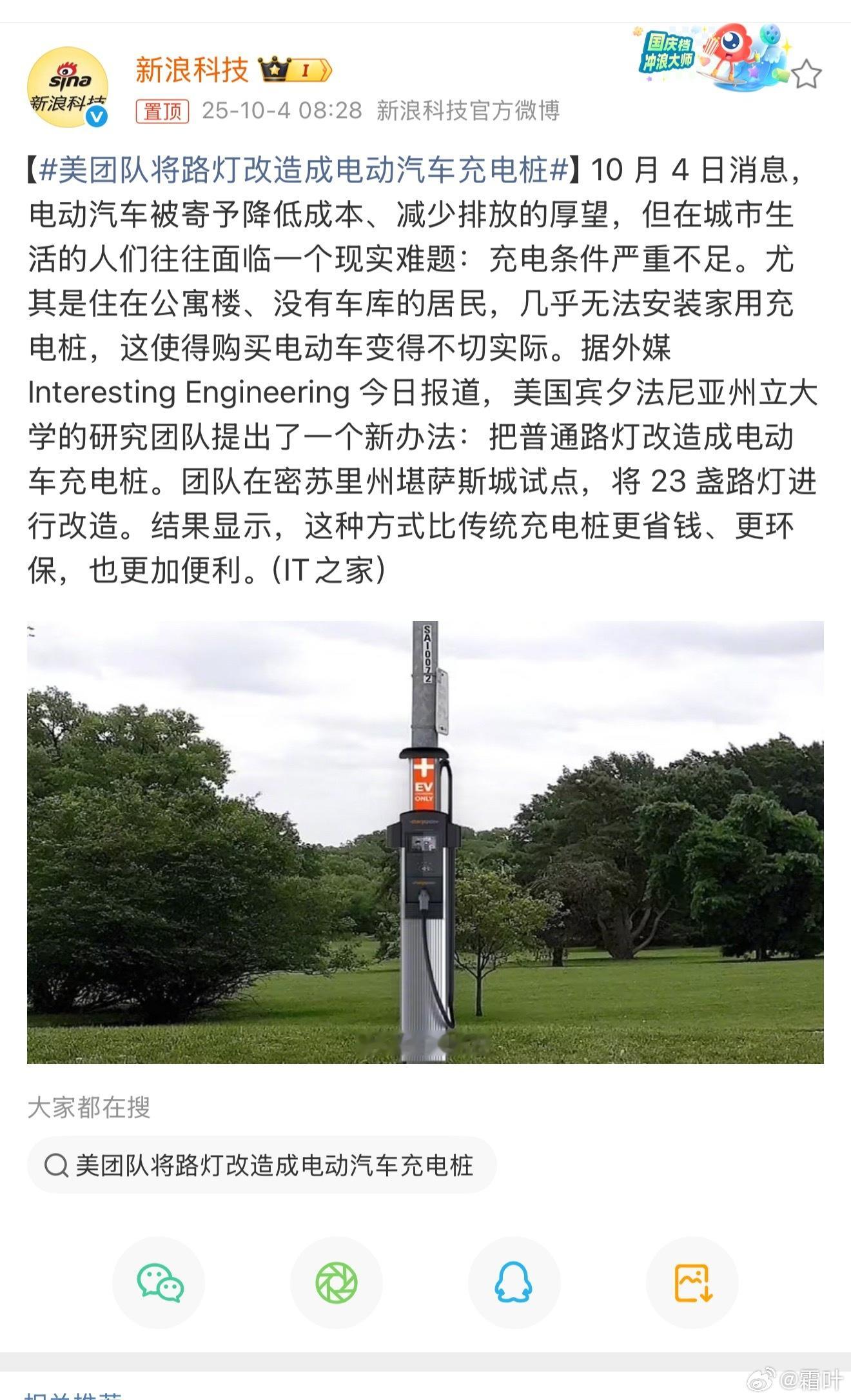 美团队将路灯改造成电动汽车充电桩草,我第一眼看成了“美团”。