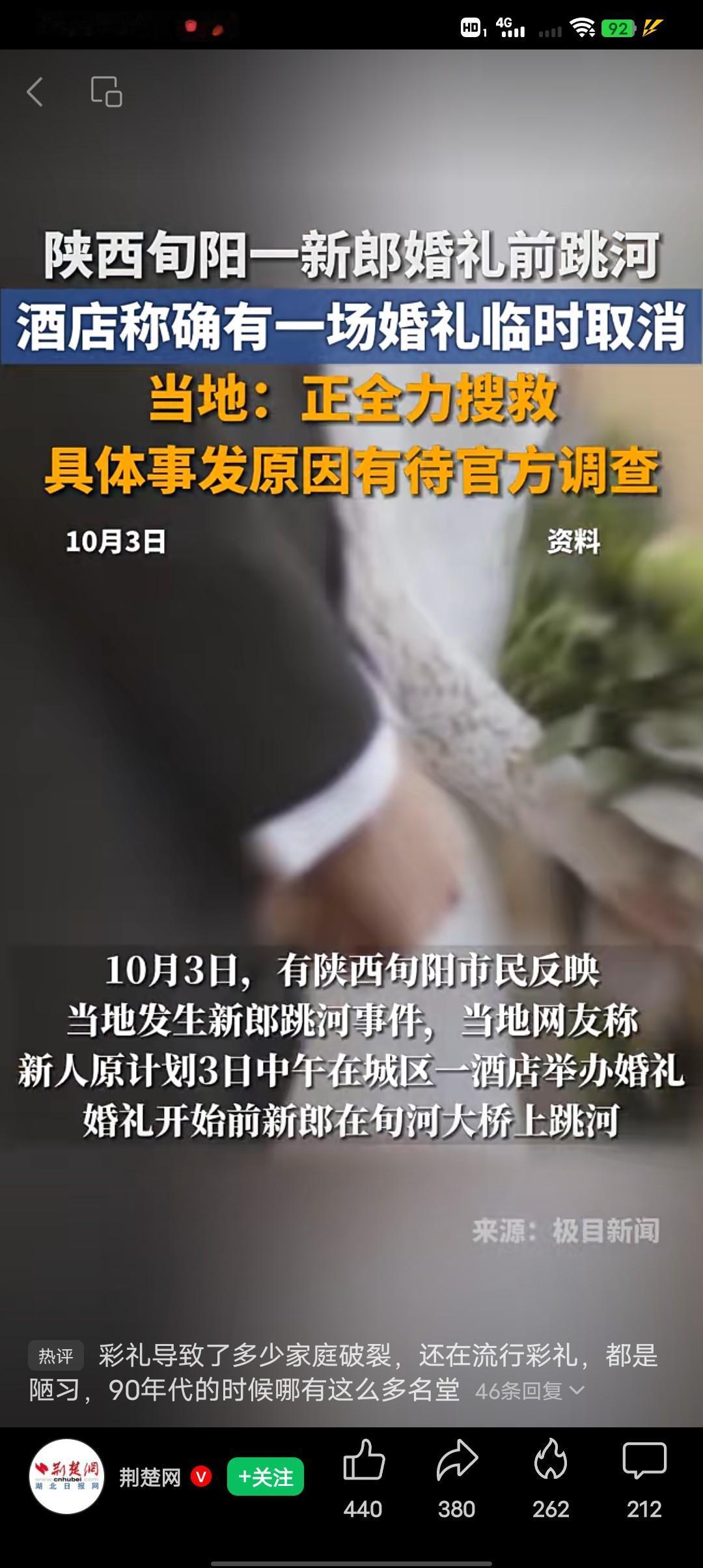 10月3号陕西旬阳一新郎婚礼前在旬河大桥跳河,酒店称确有一场婚礼临时取消。 有知情人士透露:新郎给了女方20万彩礼,女方却临时加两万元下车费,如果男方不给就不下车。男方29岁是某大学老师。 我想新郎应该是尽全力才拿出了20万彩礼吧,也许那20万也是东拼西凑借来的呢,新郎实在没办法才会选择下下策的吧,不然谁会选择结束自己的生命呢,我想新郎应该是想了好久才艰难的下定决心的吧!毕竟这样受伤害最重的还是自己的父母。 强烈建议合理化收取财力,换句话说不是说不让收彩礼,是在双方条件能接受下给出彩礼,毕竟女方也不是卖女儿,毕竟女孩嫁人是过日子的不是交易!真的希望不要再有类似的事情出现了,彩礼要合理而且还要根据情况斟酌收取,不是说彩礼给的多就证明男方看重你,有很多结婚以后家暴的难道是彩礼没给的缘故吗?我想应该不会吧!