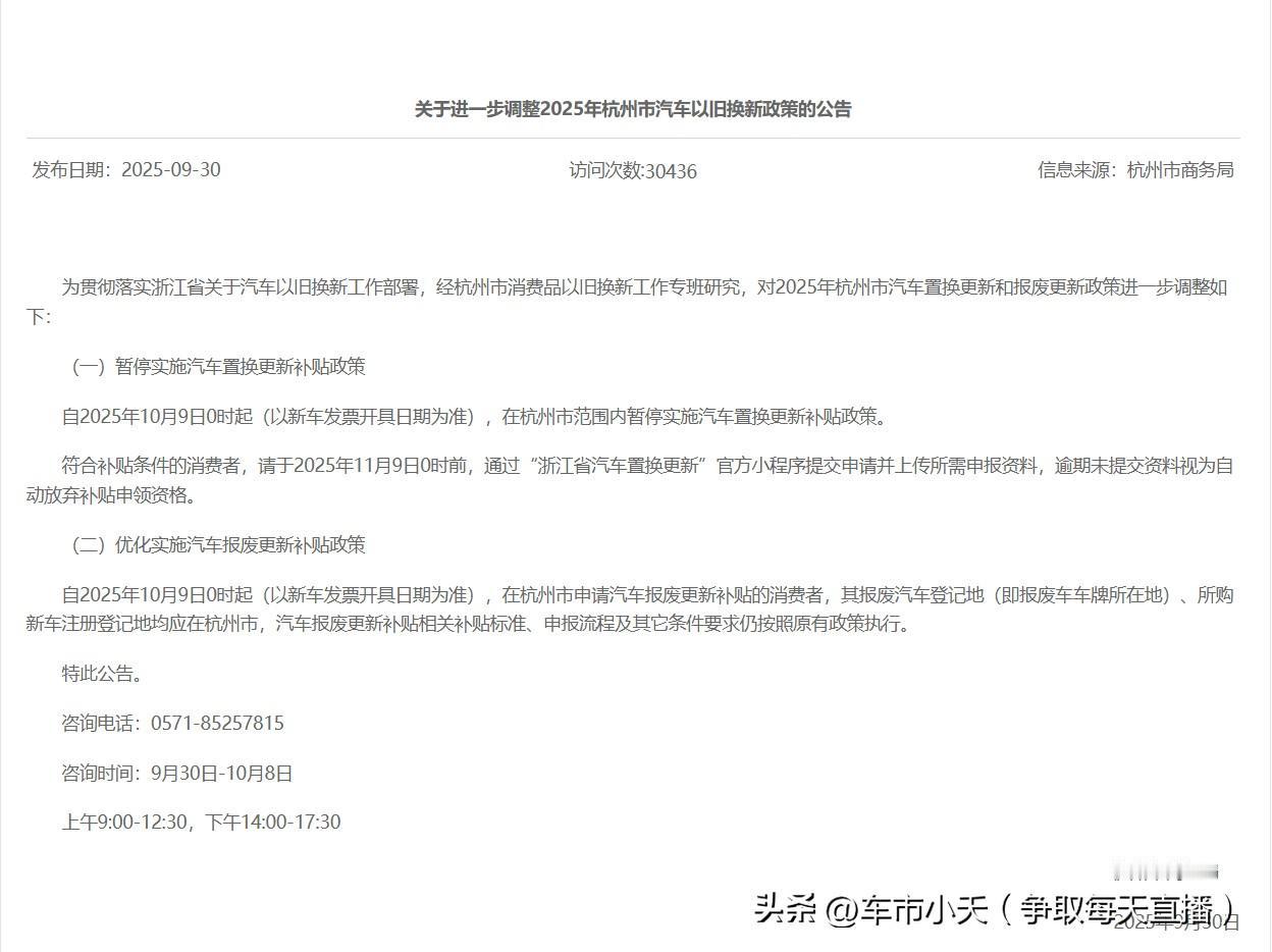杭州市的汽车置换补贴将于2025年10月9日0时停止,在截止日期之前开具新车发票