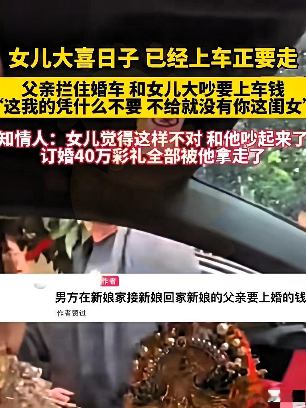 女儿大婚当天, 本该是喜气洋洋, 结果亲爹却上演了一出 “要钱大戏”!40万彩礼全被他揣进兜里,八月十五婆家给的2万节礼,他又顺走1万5, 这还没完,结婚当天还逼着公婆给“上车钱”,不给就断绝父女关系! 这哪是嫁女儿啊,分明是把闺女当成了“提款机”! 这位父亲眼里只有钱,完全不顾女儿在婆家怎么做人,更别提什么父女情分了。 婚姻本是两个家庭的结合,他却硬生生把喜事变成了“算计现场”。女儿的幸福在他眼里,怕是不如手里的钞票实在。 彩礼本是祝福的心意,不是用来填满私欲的窟窿。 要是亲情都成了“买卖”,那这婚结得还有什么意义? 你身边有这种“贪心爹”吗?要是你遇到这种事,会怎么应对? 彩礼事情 女儿出嫁彩礼 彩礼谈崩