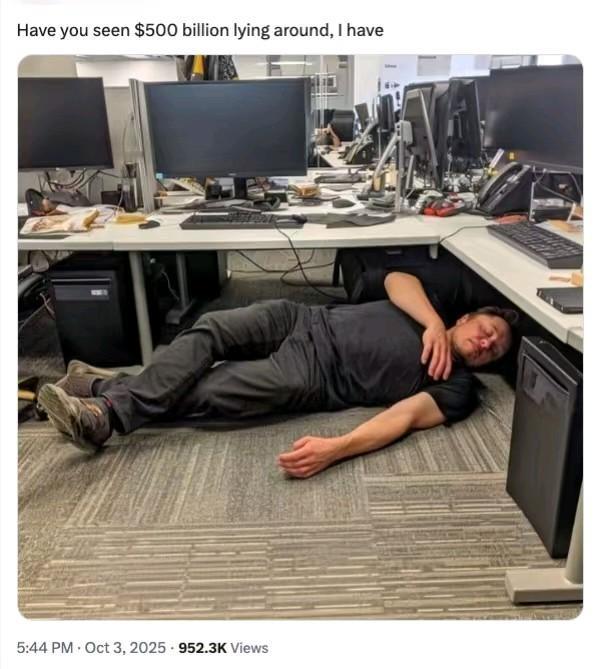 身价5000亿的大富翁也得工作,也得休息。马斯克休息照火了,但有两点不寻常。 首先他头下无枕头,除非5000亿的首富有个高科技“隐身枕”,要不就是有超强大的脖子肌肉,连睡觉都能保持这种强度。 其次是鞋子穿反了,穿鞋睡觉本来就不舒服,何况还是反穿。 首富也是爱“秀”的人,这张照片大概率ai弄的,来展示自己有多么热爱工作。 大富翁也是人,他除了孩子多,能干自己喜欢的事,其他方面与月入5000的其实也没太大区别。