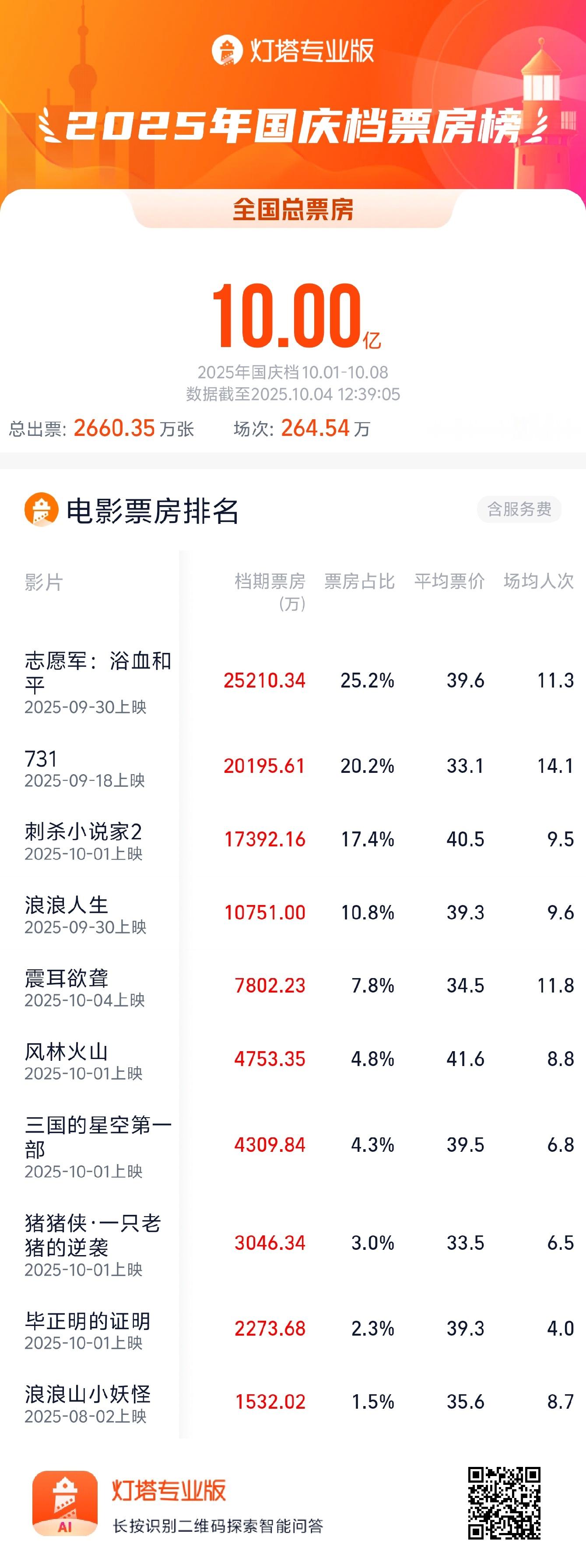 【2025国庆档电影票房破10亿】志愿军浴血和平领跑2025国庆档据网络平台数