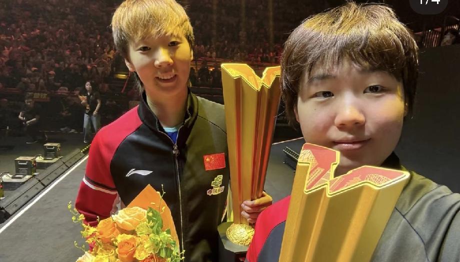 女双冠军的合照来了! 王曼昱和蒯曼三比一战胜早田希娜朱芊曦,夺得冠军! 两个可爱的女孩,太漂亮了! 两个女孩的面相真好,一看就是个很善良的人! 小曼姐的脸真圆,感觉比莎莎大一圈,可可爱爱的! 恭喜王曼昱蒯曼夺冠,棒棒的!