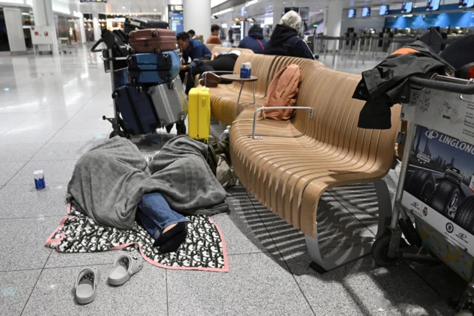 图:因航班被迫取消或延后影响数千旅客,慕尼黑机场紧急设置临时床铺并提供毛毯、饮品与点心。 (路透)