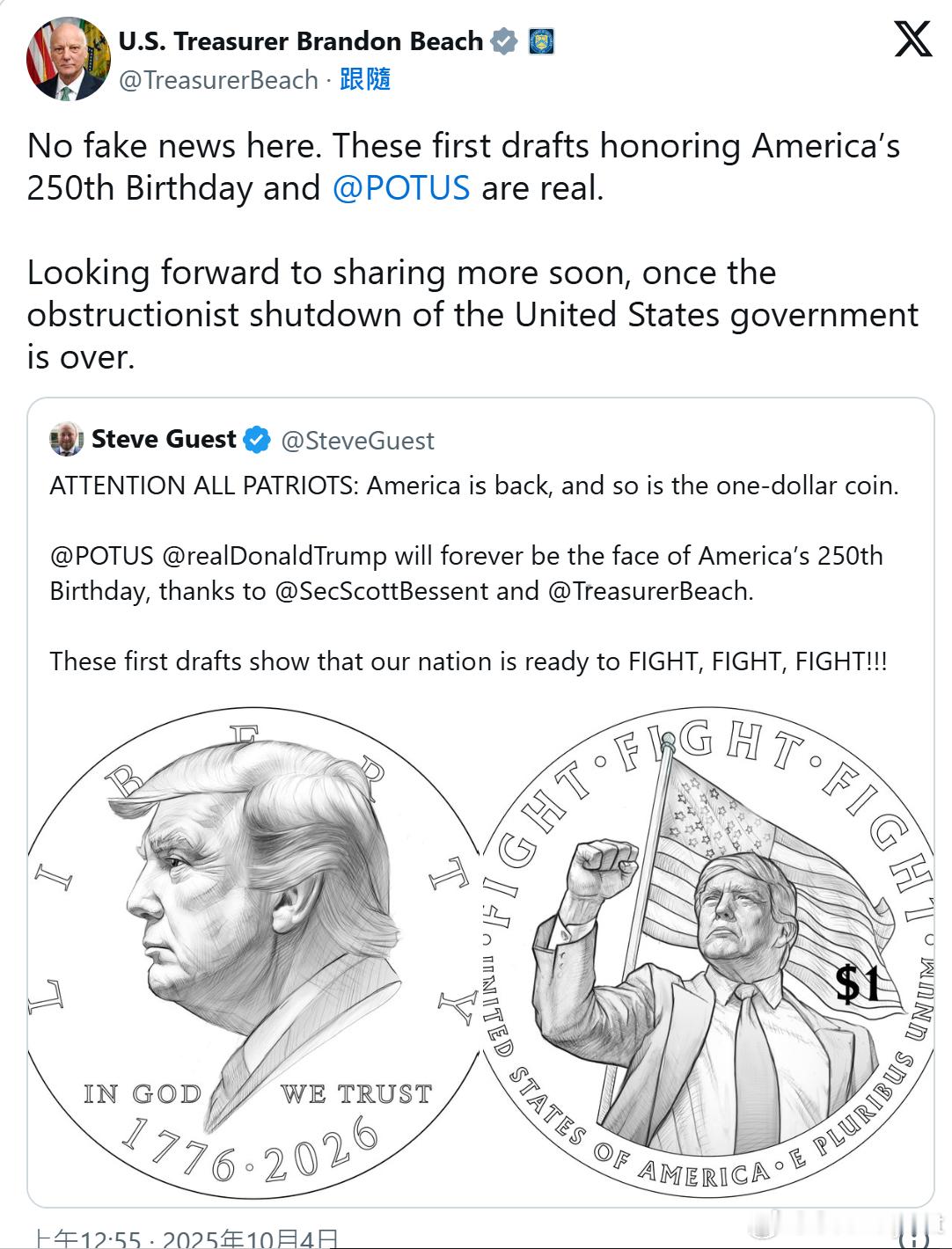 图:美国财政部司库毕治的置顶贴文中分享纪念美国独立250周年的一美元硬币初稿,主角正是美国总统川普,随即引发合法性争议。照片撷取自 X / Steve Guest