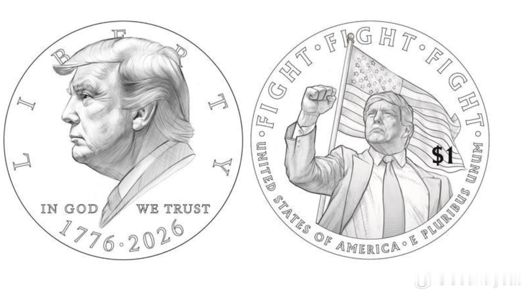 据路透社报道,美国财政部司库布兰登·比奇(Brandon Beach)在社交媒体X上分享了设计稿图片。正面为特朗普侧面头像,上方刻有“自由”,下方标注“1776-2026”;背面则呈现特朗普高举紧握的拳头,周围环绕他在2024年遭遇未遂暗杀后喊出的“战斗!战斗!战斗!”口号,背景为飘扬的星条旗。