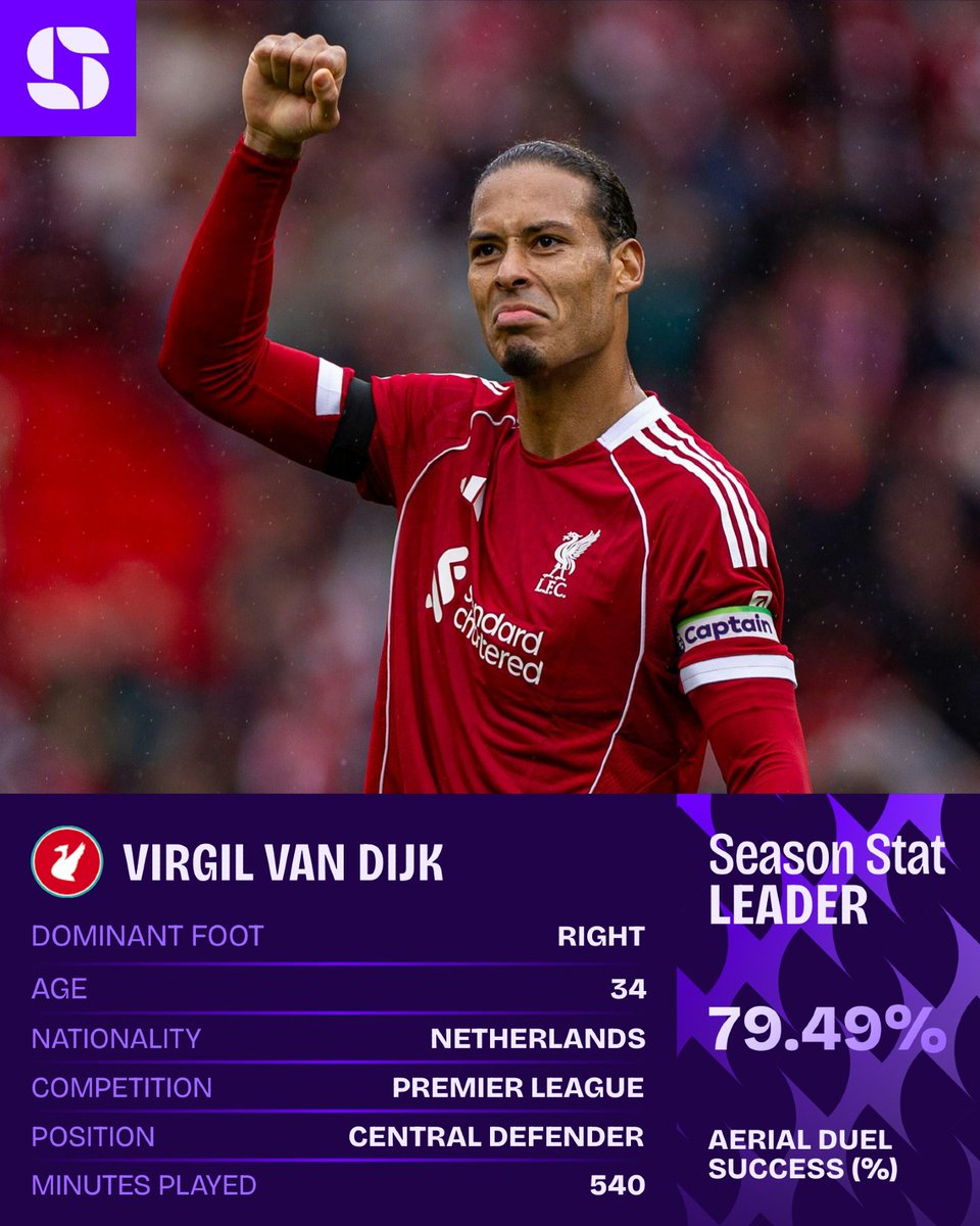 空中统治,范戴克本赛季英超头球争顶成功率居首