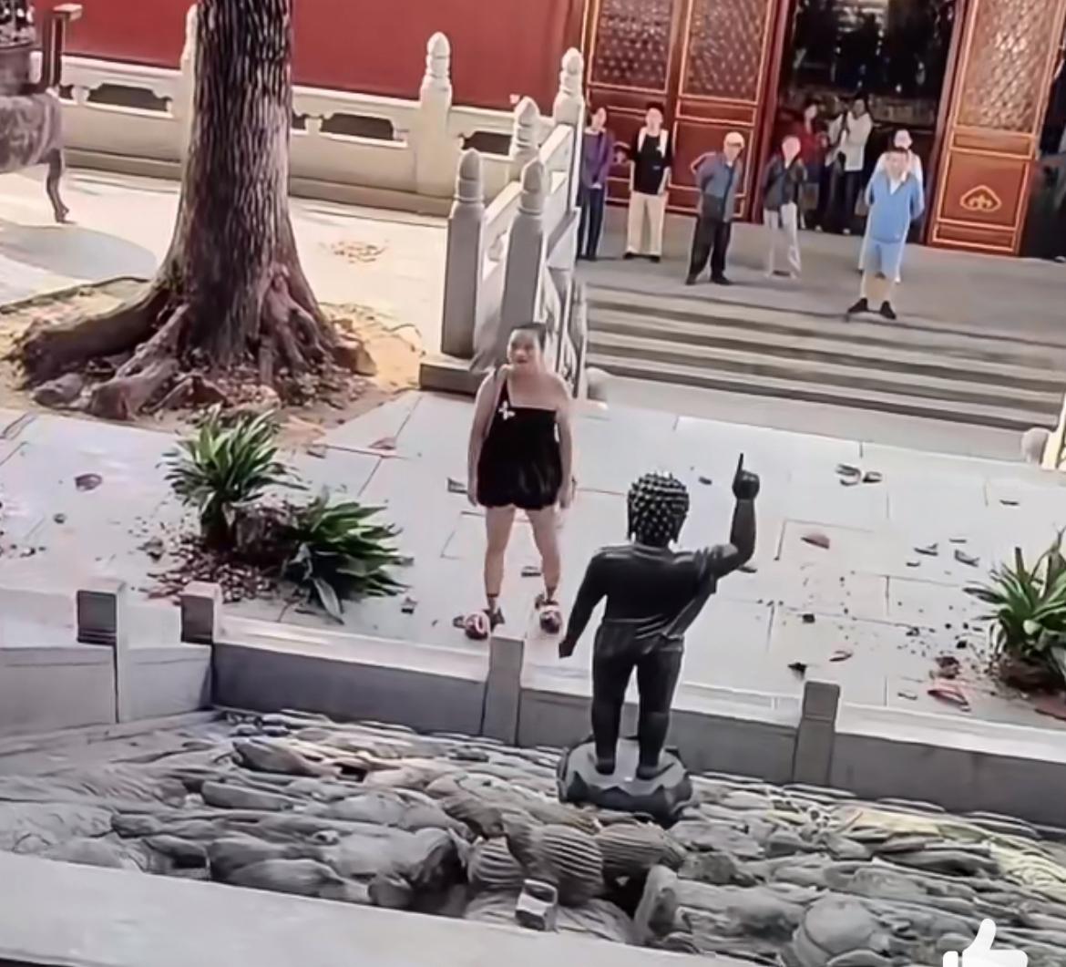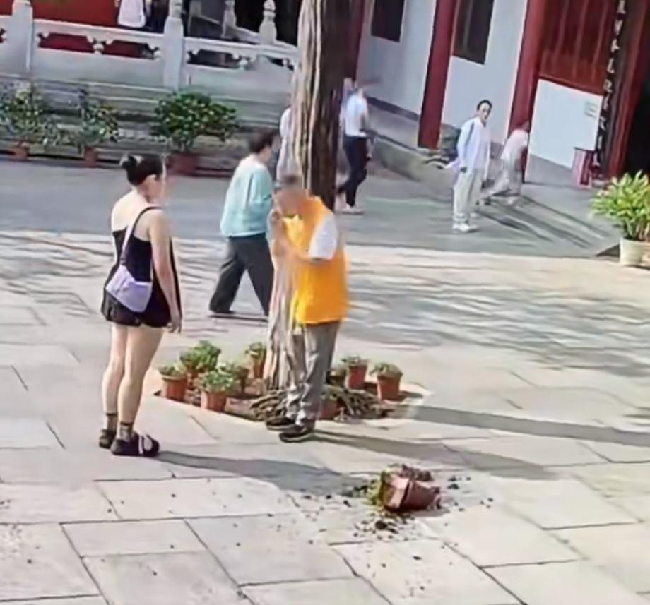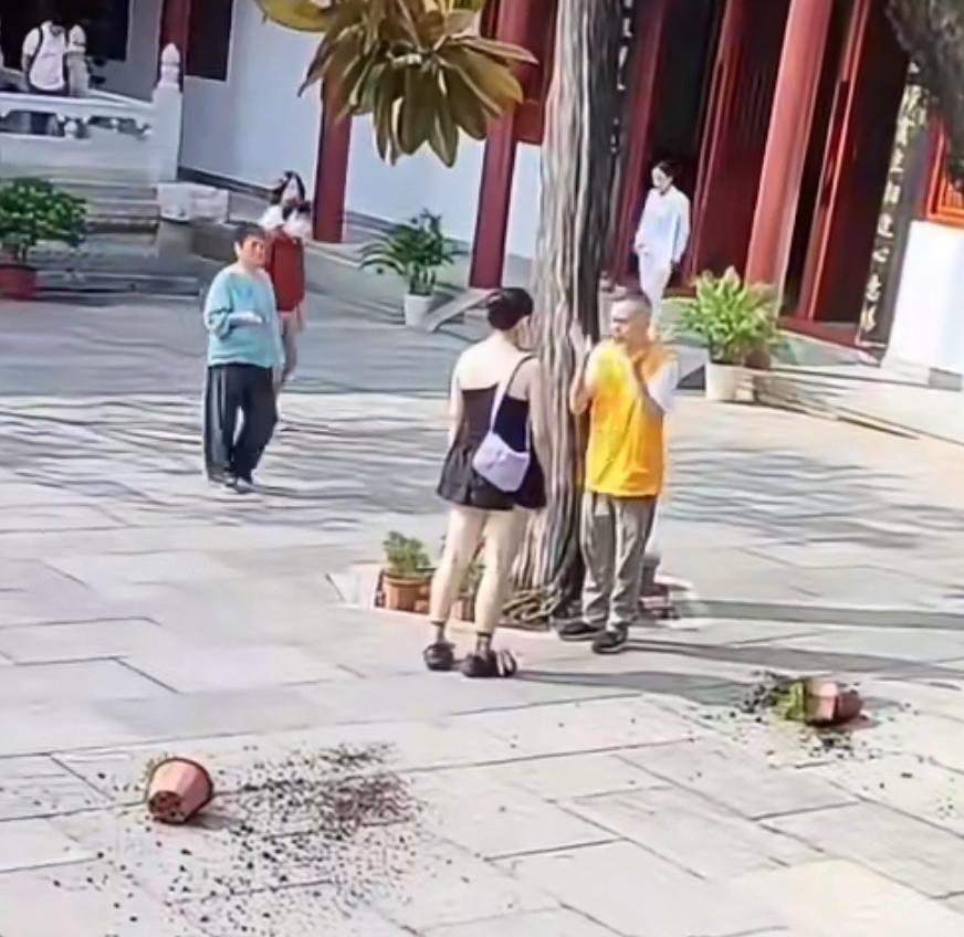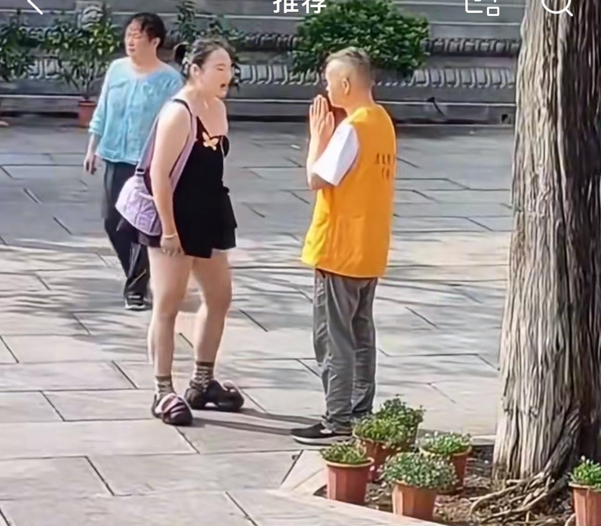 小仙女大闹寺庙,只因穿着清凉不给进大殿烧香拜佛,小仙女于是丢花盆泄愤,自称老子神J病,有钱赔得起。看看小仙女的打扮,的确进庙烧香有点不合适,有辱清修之地。小仙女一通发泄之后,疑似庙里的黄马甲义工给她道歉,不停双手合十鞠躬,还自扇耳光。一个保安过来,说要报警,女滴说,你报啊。公园里的小仙女 小仙女
