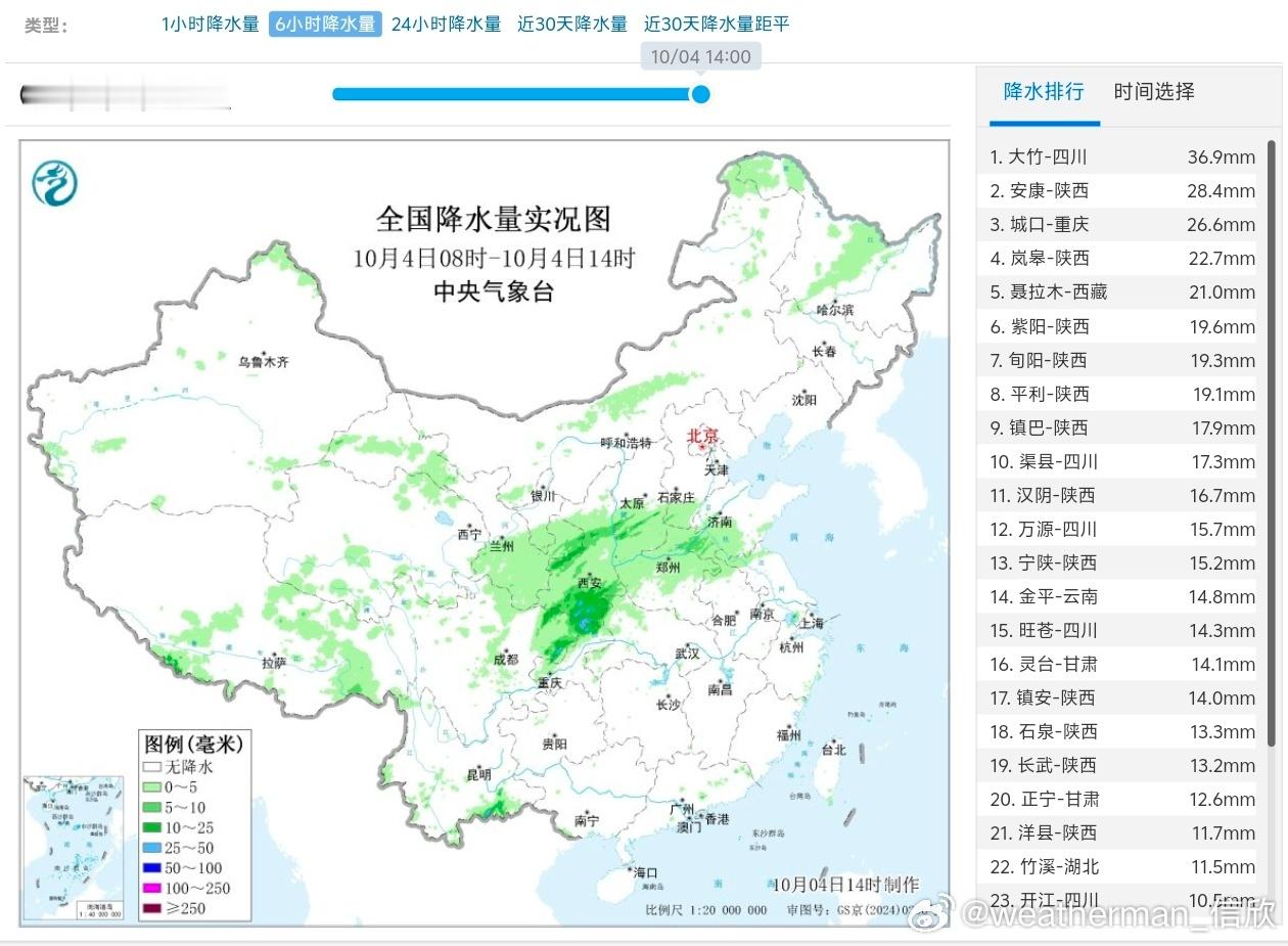 根据中央气象台发布的暴雨蓝色预警:预计,10月4日14时至5日14时,海南岛中北部、广东西南部、西藏东南部以及四川盆地东部、陕西南部、河南西北部等地部分地区有大到暴雨,其中,海南岛东北部局地有大暴雨(100~220毫米)。