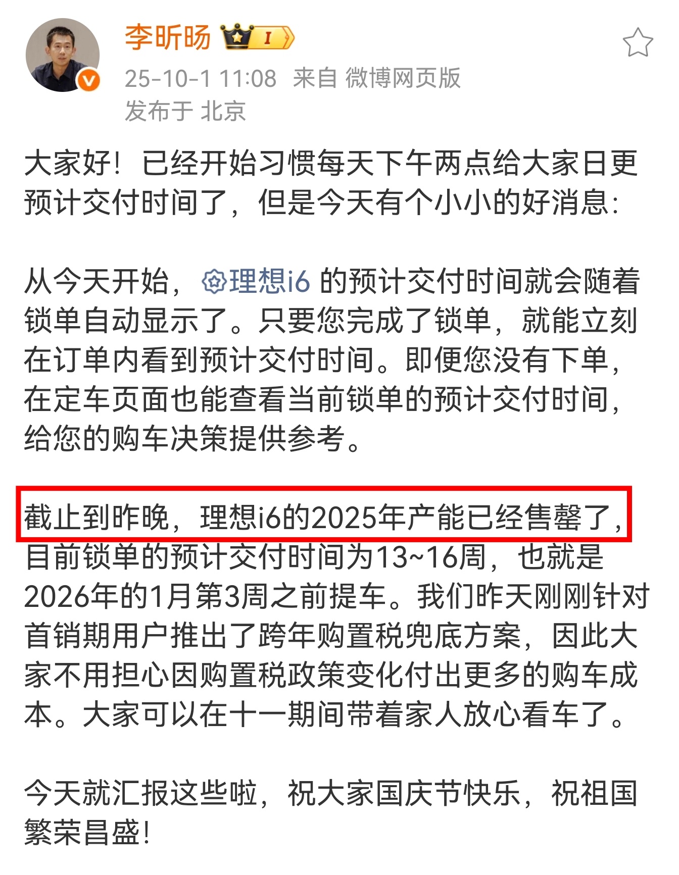理想产品线负责人:截止到9月30日,理想i6的2025年产能已经售罄。
