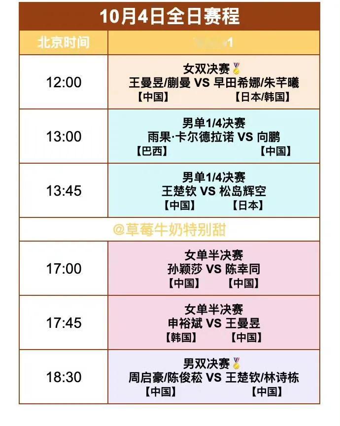 10月4日中国大满贯男单4强决赛,预盼着向鹏4一3雨果,王楚钦4一0松岛辉空。 因为向鹏之前赢过雨果,也是陈振江指导的场外,这次也是陈指导更温和细心,更适合向鹏,结果真是4一3[赞][赞] 王楚钦越后压力越下,混双完成了,男双决赛是队友,只有单打他的压力变小了,也越打越释放越来越兴奋。结果4一1松岛辉空。[赞][赞][赞]基本预盼成功[赞][赞][赞][呲牙][呲牙][呲牙]