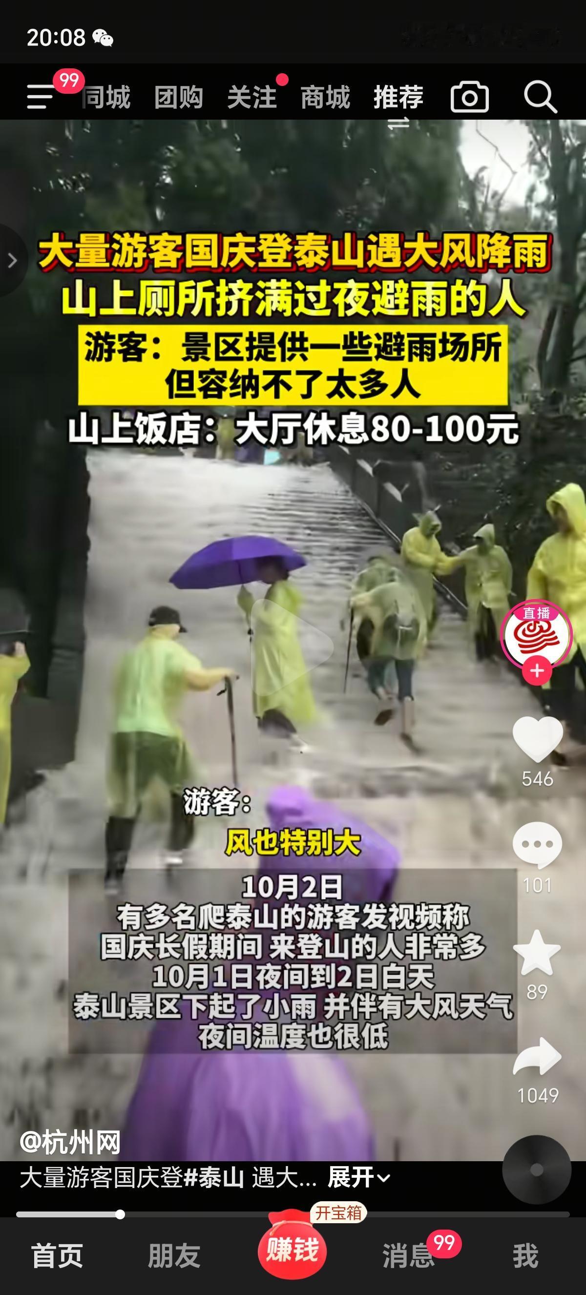 今天泰山最大的赢家不是游客,是当地商贩们,拐杖很畅销,几会人手一个,雨衣雨伞也很畅销,几乎人手一个。 拐的价钱普通的3元到20多元不等,桃木拐杖50元到上千元不等。门口摊贩的雨衣一次性的平时10元一件,国庆期间50元一件,景区便利店雨衣30元一件,雨伞45元一把。 突然想去泰山脚下卖雨衣雨伞还有拐杖了,不知道还来不来的及?