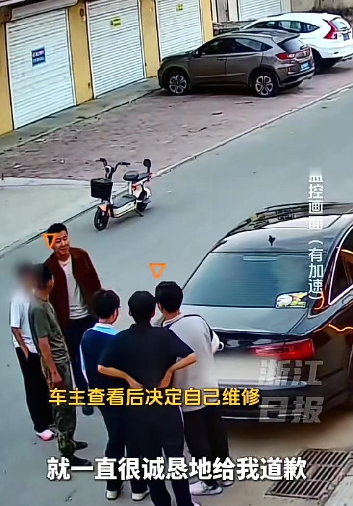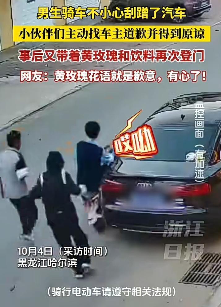 三名学生放假在街头玩耍,一名骑着电动车的不小心蹭到了停在路边的高级小轿车,他们没有想着逃离在环视了一圈后到处寻找车主,在附近火锅店找到了车主,说明情况后车主急忙去查看被蹭情况,三名学生一直跟随左右,不停的道歉并表示愿意共同承担维修费用,车主看他们是学生并且愿意主动承担责任,尤其是另外两名同学根本不关他俩的事依然决定和小伙伴共进退,这种义气感染了车主。 本来爱车被蹭一肚子火气,但是看到孩子们勇于承担责任并且非常讲义气,于是对他们说早点回家,没事我自己修修就可以了,就这样三个孩子离开了,他继续回火锅店,那是他母亲的火锅店今天有空特意来照料一下,没想到半个小时后三名学生带着黄玫瑰花和几瓶饮料来表示歉意,一时弄的车主怪不好意思的,还从来没有人给自己送过鲜花,每次过节都是自己给媳妇买红玫瑰花,虽然他们是孩子但是举动却一点不亚于大人,可能他们的父母更优秀,才能教育出这么有担当的孩子,车主沉思很久后说:没想到现在的孩子被教育的这么好,他们承担过失的那一刻不仅是对无意的醒悟,也是对未来的启迪,如此有责任心的孩子在以后的社会上必然能有一番作为。 只能说讲究人遇到讲究人,在了解了情况后一方讲究人愿意将就处理,而另一方用自己独有的浪漫主义情怀温暖了车主的将就,对于孩子多一些包容让他们茁壮成长,在温暖的社会中感受到更多的情真意切,愿意承担责任是一个人最优秀的品质,和同伙共进退那么就是仗义走天涯。