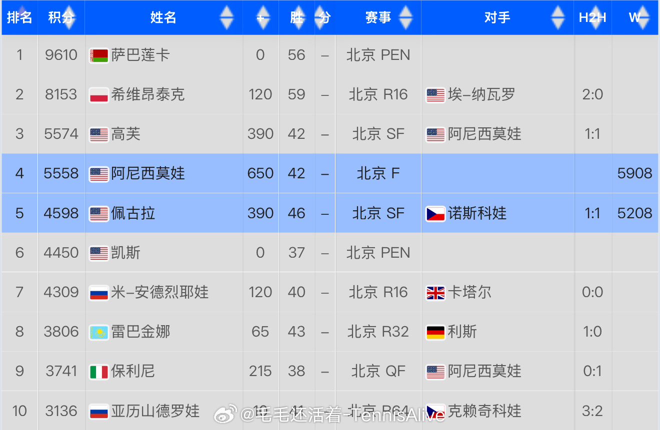 阿尼西莫娃冠军积分只和高芙差16分了。而年终总决赛的争夺越来越明朗。保利尼和莱巴金娜争夺的越加激烈。而压力娃还有可能,当然她得在武汉等比赛有更好地发挥。所以现在还是有点悬念的。