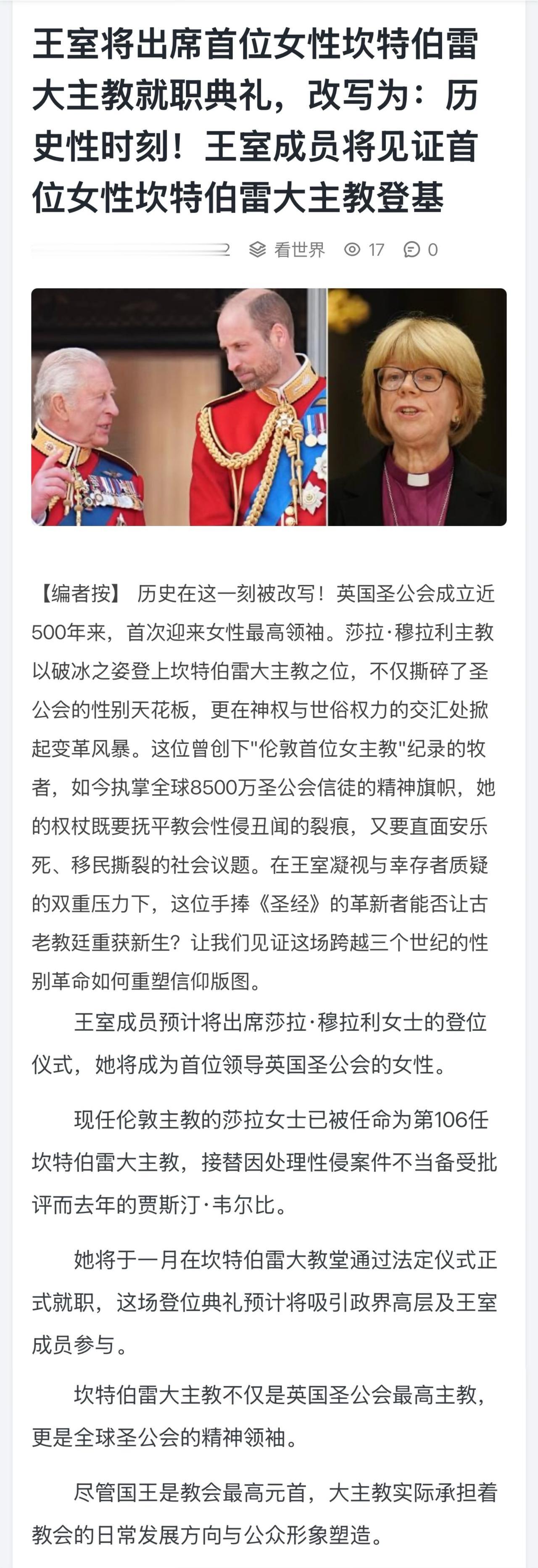 英国迎逾千年来首位女性坎特伯雷大主教 穆拉利曾是一名职业护士,如今则是英格兰圣公会(也称英国国教会)首位女性大主教。 坎特伯雷大主教这个职位拥有1400多年历史,长期由男性垄断。上一任大主教韦尔比,去年11月因掩盖儿童虐待丑闻而辞职,此后这一职位空缺至今。