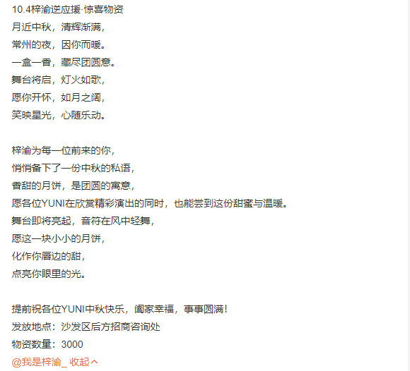 梓渝给粉丝准备了月饼,梓渝提前祝各位中秋快乐,谁来懂一下这个小梓渝的真诚感啊,那就期待住待会和梓渝的舞台的见面啦~​​​​