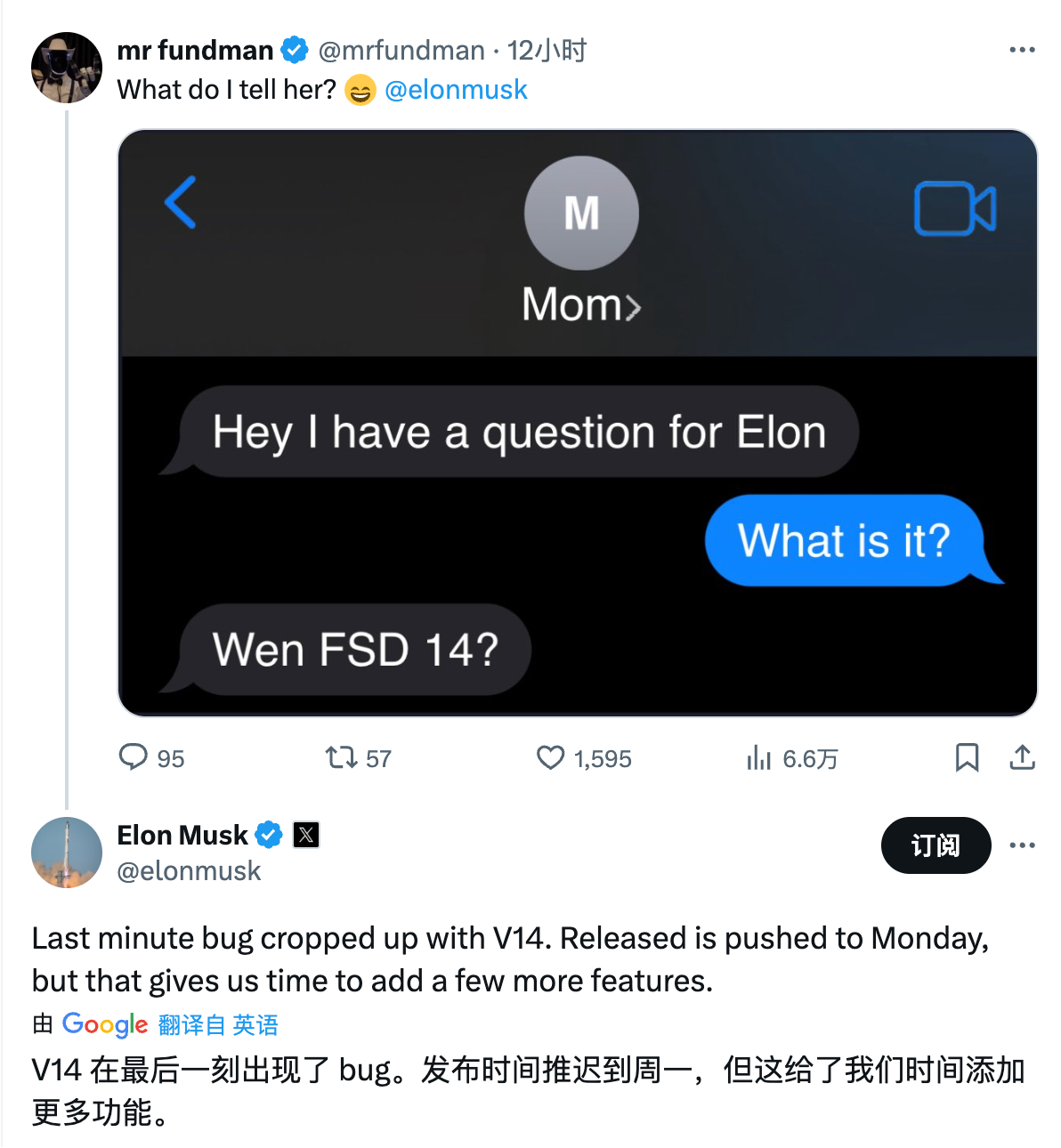 Elon Musk 说原计划本周推送的特斯拉 FSD v14 在最后一刻出现了 bug,所以发布时间推迟到了周一,但这也给了特斯拉更多时间添加新功能。