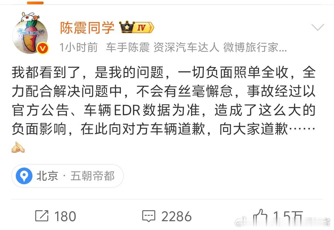 陈震致歉这场事故基本就这样结束了,陈震自己的问题他也认了,全责已经定了,接下来的工作就是配合解决问题,赔偿问题。至于其它的也没啥可说的,这种事也不应该开玩笑和煽风点火。只希望受害者能平安,早日恢复!