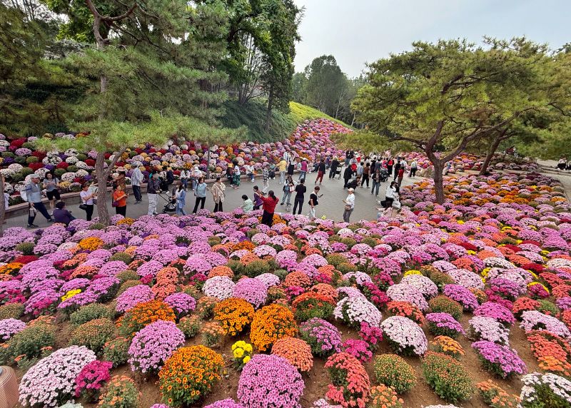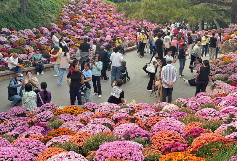10月4日,日坛公园,游客在菊花谷观赏菊花。起伏有致的土坡上,十几种颜色的8000多株千头菊竞相绽放。