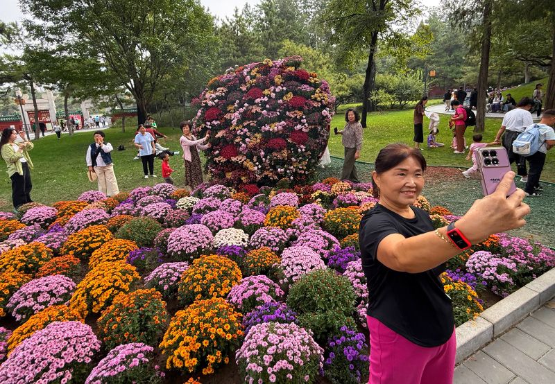 游客在菊花前拍照留念。千头菊的花期将持续到10月底,十一假期是赏花的最佳时机。