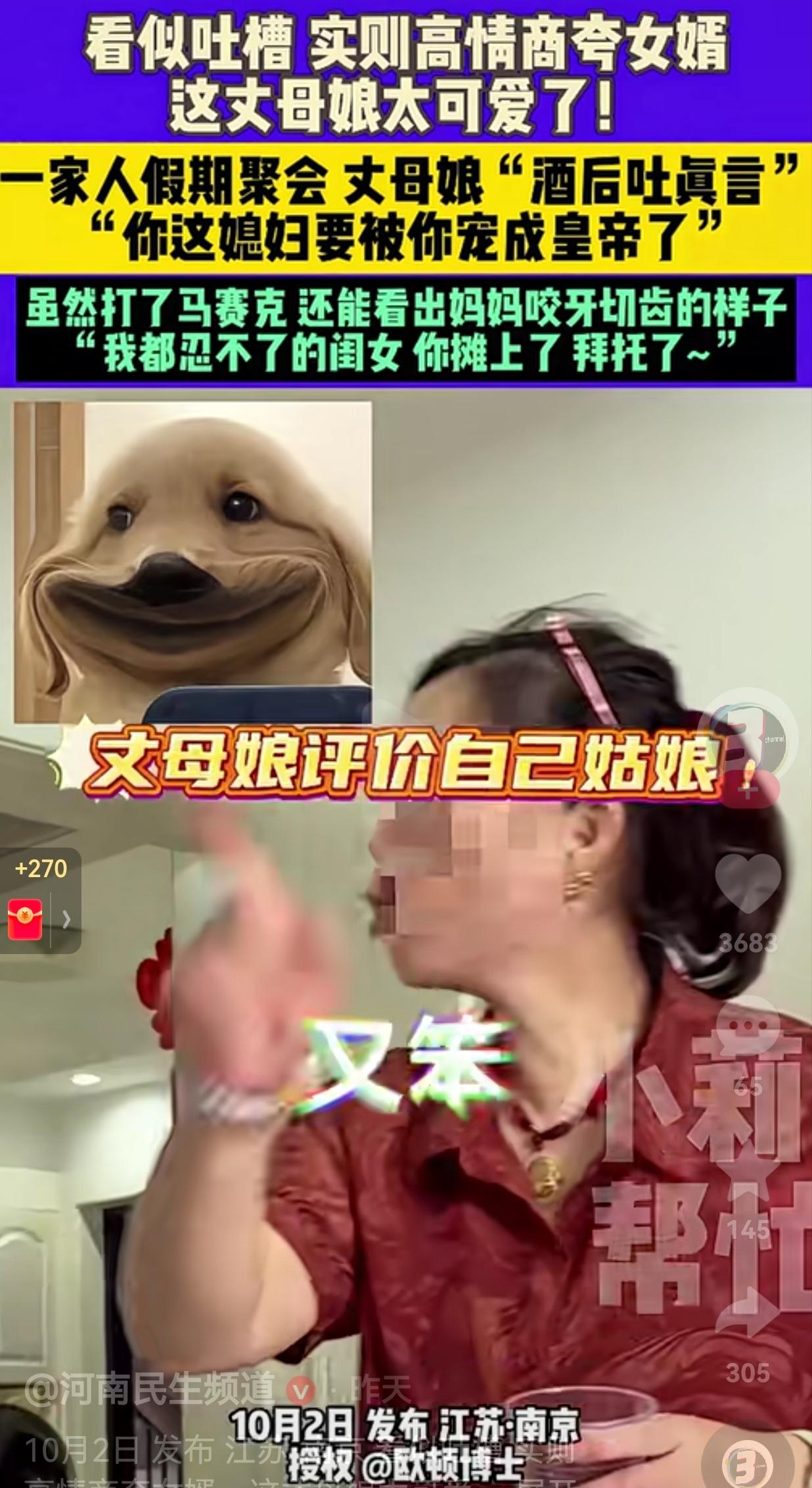 人间清醒呀!国庆假期到了,一家人开启了暑假聚会,用餐结束后,丈母娘酒喝多了,就开始疯狂吐槽自己的女儿。真的堪称现实版的“酒后吐真言”呀! 只见丈母娘说自己的女儿,又懒又馋又笨又好吃,也就是女婿的脾气好,能忍让,又有宽容心,如果换成我一天也忍受不了的。 你再看看她那个腿,你给她养的太好了,吃饭的时候,也不要让她吃太多,让她减减肥,知不知道呢? 听着丈母娘的疯狂吐槽,女婿简直笑疯了! 网友看到后评论说,丈母娘看似是吐槽自己的女儿,实则是高情商夸赞自己的女婿,这丈母娘太可爱了! 还有的网友说,同款丈母娘,其实这才真的是情商高,这才叫真的对女儿好,大家自己悟。 当着大伙的面,疯狂夸赞自己的女婿,吐槽自己的女儿。说白了就是让女婿对女儿宽容一点,别跟她一般见识。这才是高明之举 女婿不是自己亲生的,不能当面说女婿不好,但是,女儿是自己亲生的,就算多说了几句,又如何呢?也不会记仇的。老母亲这样做一方面是给女婿面子,另一方面就是让女婿对自己的女儿好一点。 大家觉得呢?欢迎大家评论区讨论留言。