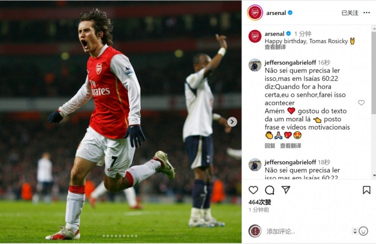 阿森纳官方社媒晒出罗西基效力球队时期的照片,配文:“生日快乐,罗西基。”
