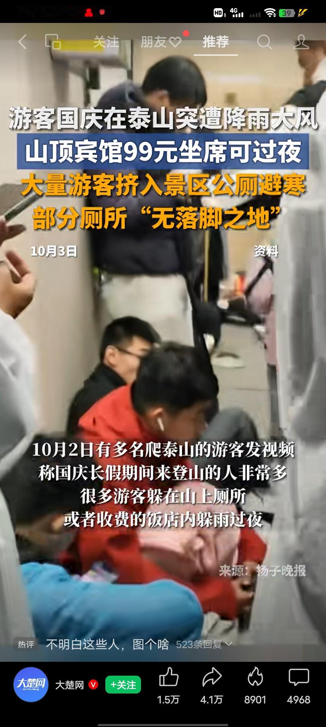 知道啥叫旅游吗?旅游就是不出门不死心,出了门死的心都有,旅游就是远看像逃难的,近看像要饭的,经过了解才知道是一群吃饱了没事干的。 有钱人的世界咱不懂,出去爬泰山的遭罪了。10月3号爬泰山的游客遭遇强降雨大风,山顶宾馆在大厅99元坐席可过夜。有好多游客为避寒躲进公厕,部分厕所已无立脚之地。 我就纳闷了,假期花钱旅游是出去玩呢还是遭罪呢?或者说就是一个名头,我假期出去旅游了,至于在外面怎么样,或是享受或是遭罪我不说没人知道。这算不算死要面子活受罪呢?往年也都是一样,假期旅游就是去你别人厌倦的地方,吃别人吃够了的东西,别人来欣赏你看够了的风景。 年年犯同样的错误,今年遭罪以后再也不去了,明年又忘了。还有人说,说不出去的一看就是年纪大的,年轻人要的就是这个心态。我也是没钱,我就喜欢在家里宅着,想怎么吃就怎么吃,想怎么睡就怎么睡,反正下多大雨我都不怕淋着,刮多大风也不怕被吹走,这是穷人唯一的好处吧!