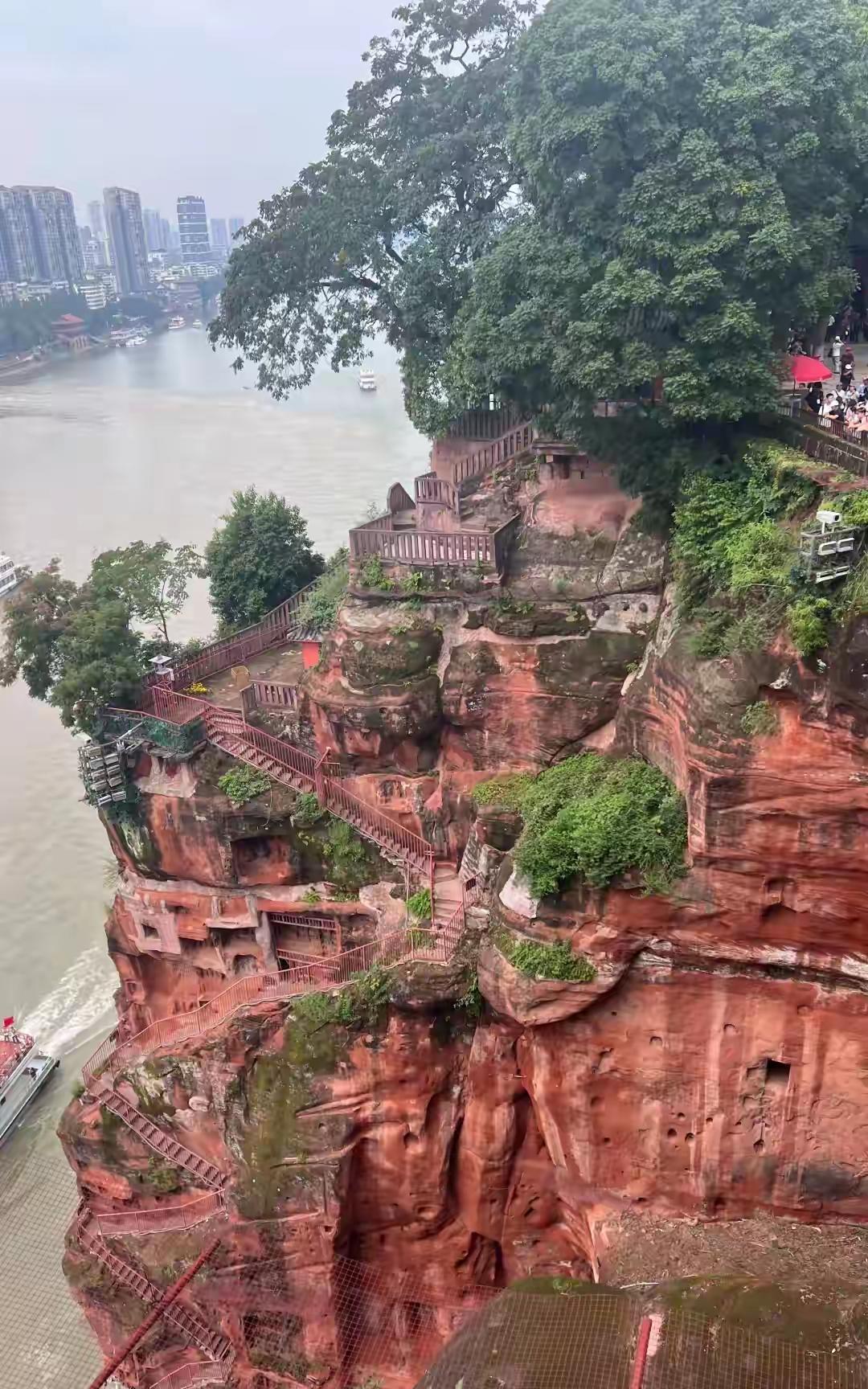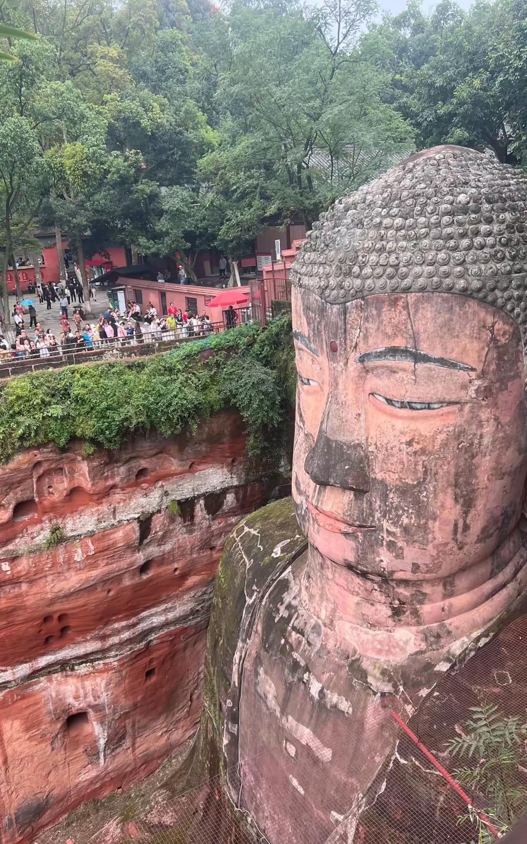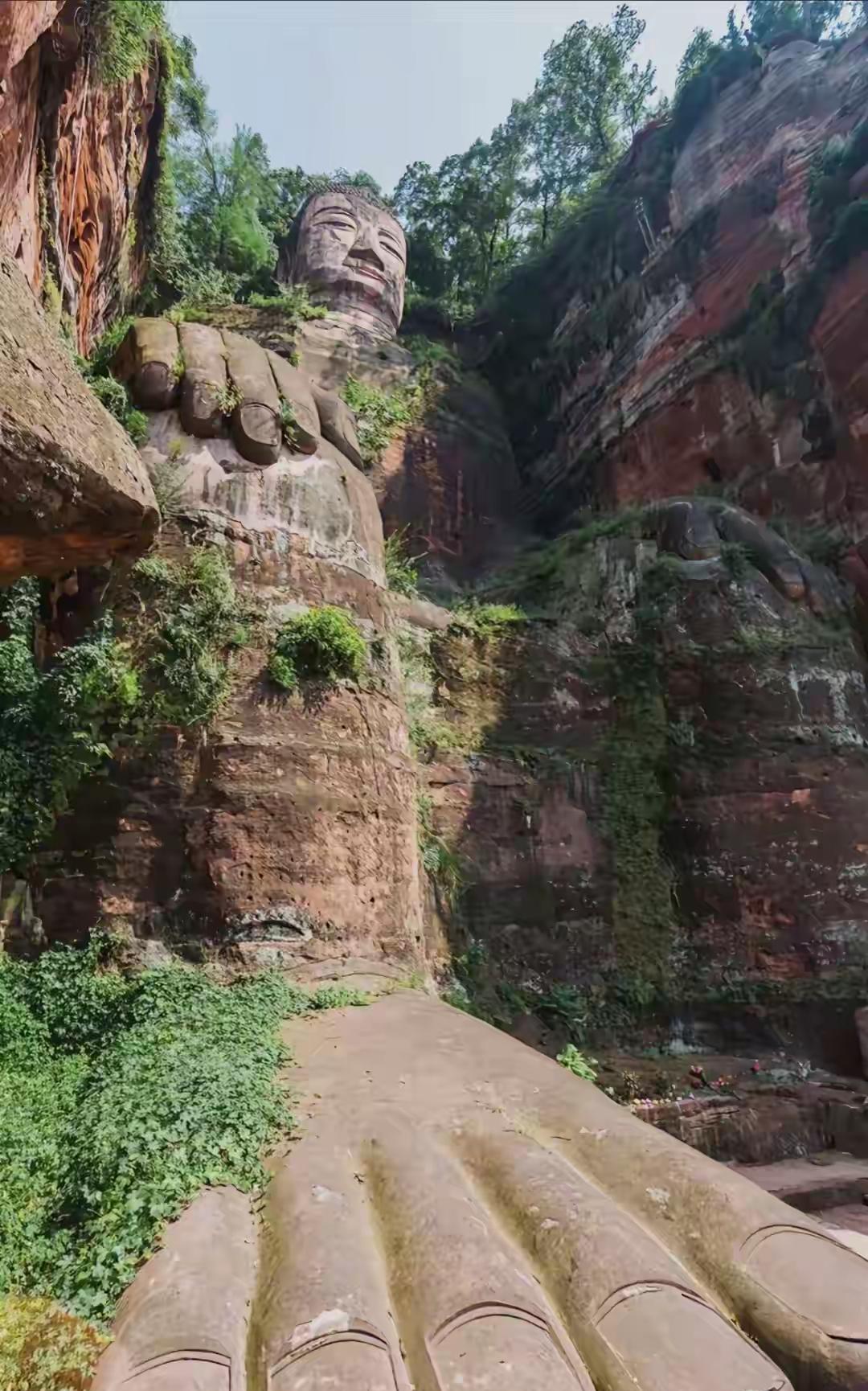 都说乐山大佛身形高大,佛脚宽阔,但我所关注的是,这种红色的泡砂石岩体,何以能独独用来修筑如此高大的一尊石佛像,且历经千年而不被风化呢? 你看乐山大佛,其材质与旁边的岩体着实有些不同。每日有众多游客前往,那狭窄的栈道竟能承受如此多人的踩踏,也算是一大奇迹了。这或许就是冥冥之中有佛佑护的缘故吧。 我觉得乐山大佛真能给我们带来好运。我两次前往乐山大佛参拜,无论是工作还是其他娱乐方面,都有意外收获。 这个国庆节,你到乐山大佛游玩了吗?
