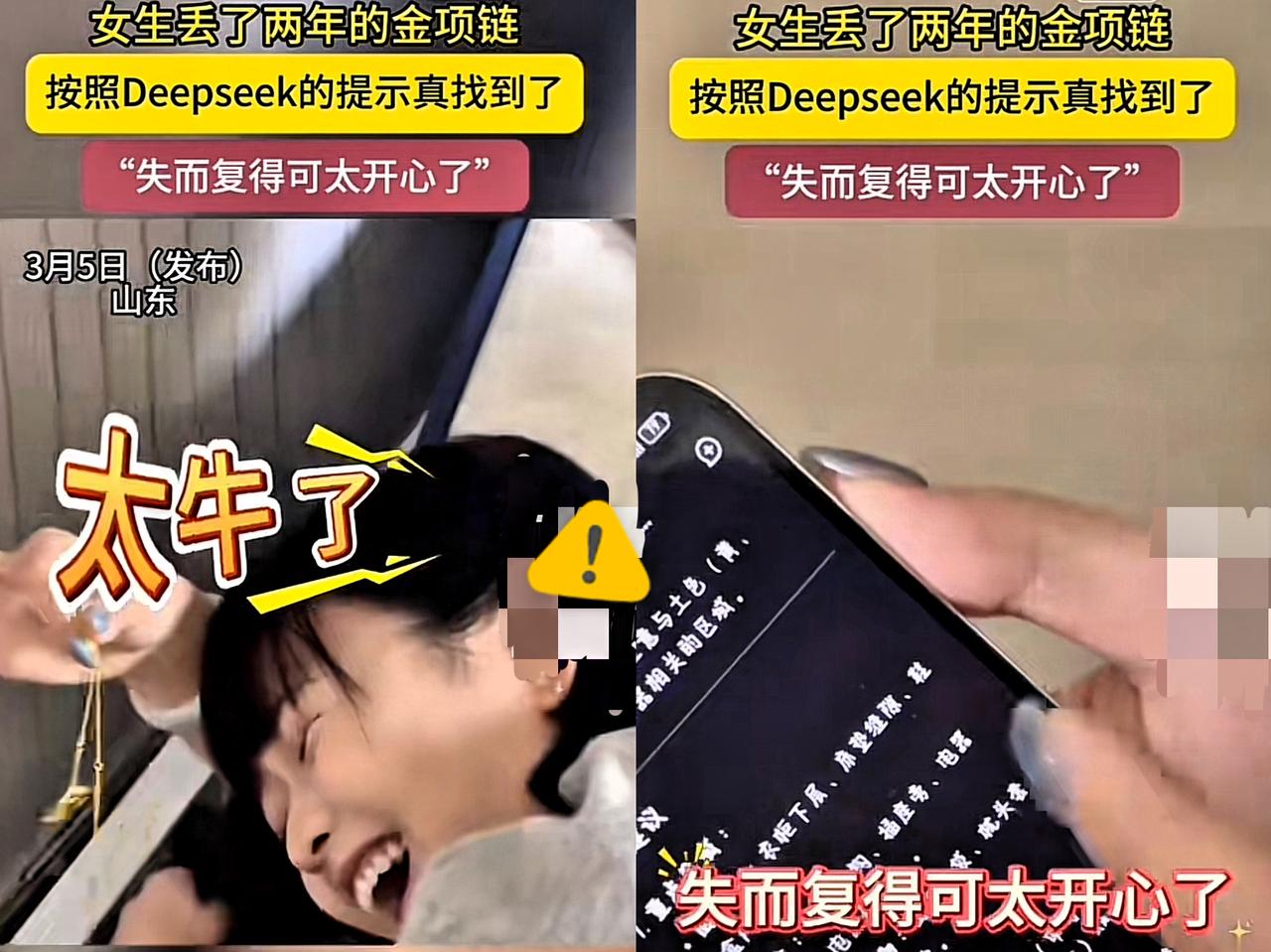“人工智能立大功!” 山东大姐丢了两年的金项链,怎么找都找不到,索幸放弃了,现在居然被 DeepSeek给“挖”出来了,这操作太神了! 赵女士当初为找项链把家翻了个底朝天,衣柜、沙发底、梳妆台全搜遍,最后只能遗憾认命。 直到刷到有人用AI找回身份证,她抱着试试的心态打开DeepSeek,把最后见项链的场景、找过的地方全说清楚。 没成想AI直接点破关键:“看看床垫和床架的缝隙”。 掀开床垫的瞬间,那抹冰凉的金属触感,让两年的遗憾全成了惊喜。 其实AI哪有超能力?不过是跳出了人找东西的思维盲区,提醒那些我们默认“不可能”的角落。 这才是科技最暖的样子,不是什么高大上的黑科技,而是帮普通人捡起差点弄丢的小确幸。 那些被忽略的旧物里,藏着的可是实实在在的回忆。 你们丢过最久的东西是啥?敢不敢试试让AI帮你找找线索?ai项链 ai手链 人工手链 ai金饰 ai玫瑰金手镯 智能芯项链 ai金镯子