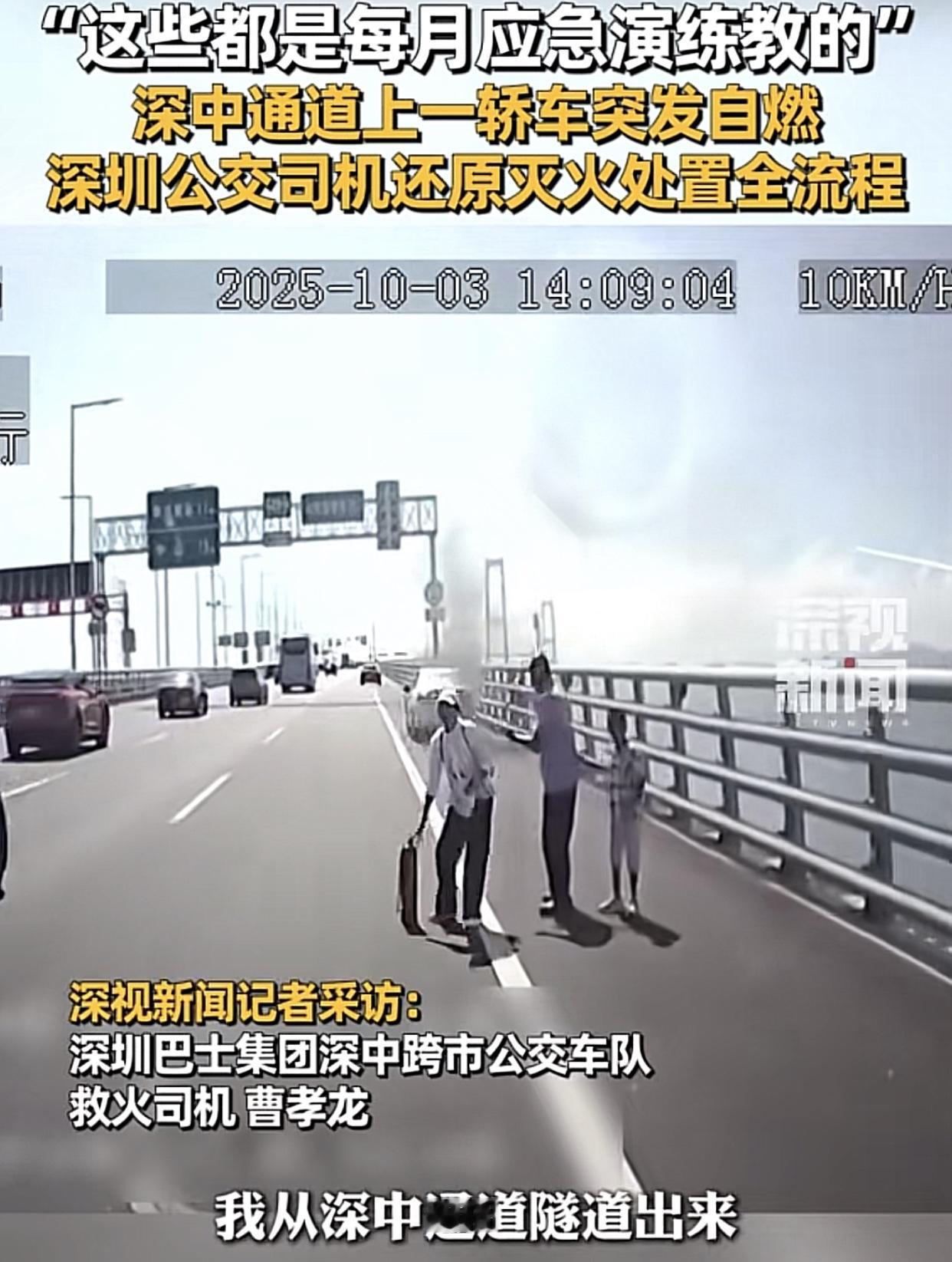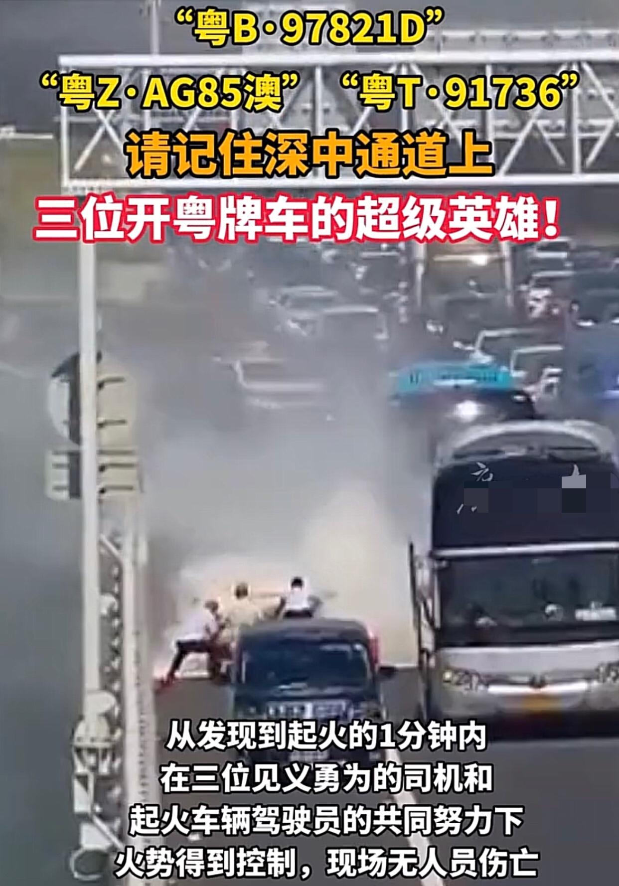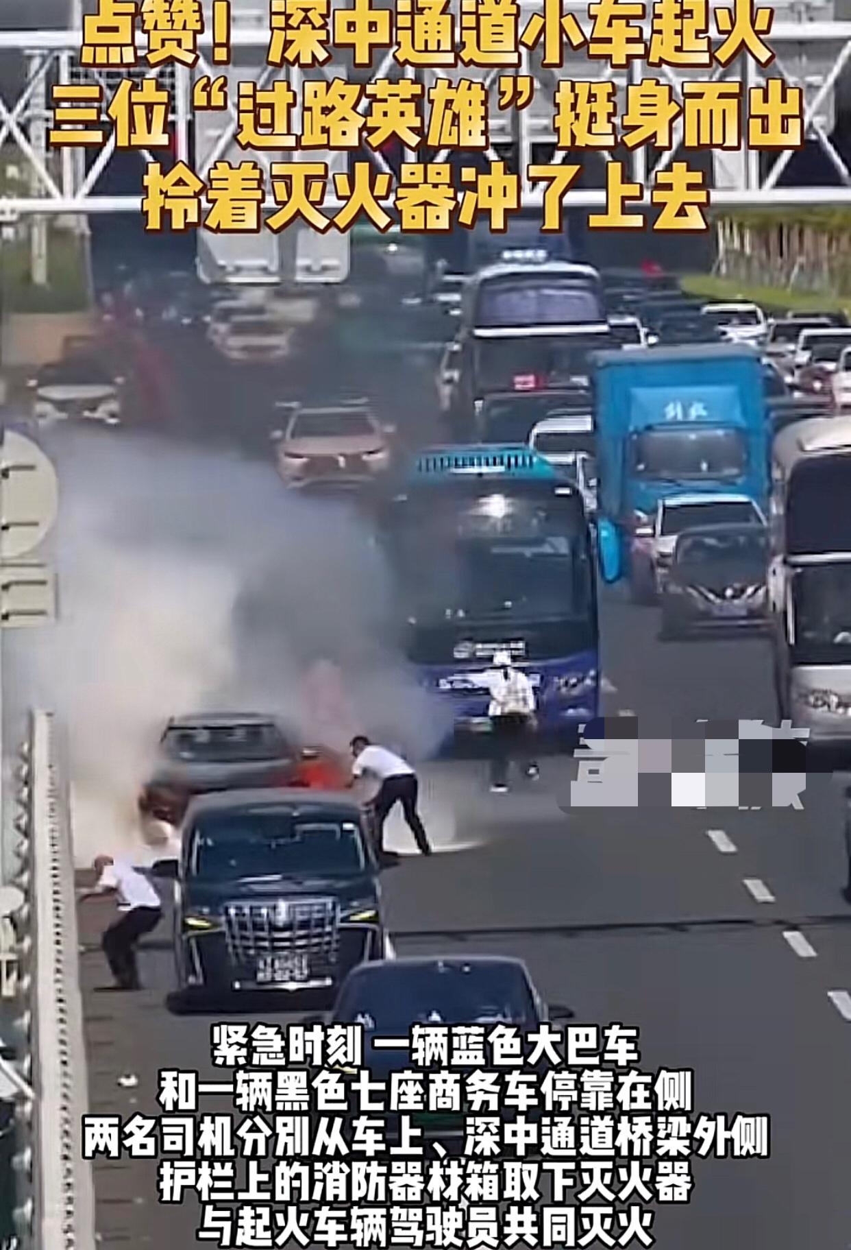 10月3日下午两点左右,深中通道!深圳往中山隧道出口处应急车道,一辆白色小轿车发生自燃,车上一家三口惊慌失措站在桥边招手求助。 这时,一辆蓝色挂深圳牌的跨市公交车司机见状,赶紧停车从车上抱出一个灭火器进行扑救。过程中还有一辆澳门牌照的黑色七座商务车,一辆灰色中山牌照的大巴车,和着火小车司机合力救火。不到一分钟就将火势控制,事故中没有人员伤亡。 (来源:深视新闻) 还好不是在隧道里面,隧道着火后果不堪设想 此路段去年就发生过两起车辆着火事故,有人猜测,在较特殊,特别是高温的天气条件下,有没可能形成某段区域的异常电磁场,激发了车辆电池组击穿引发线路短路引燃汽车火灾?不过,这只是揣测,真正原因还是留给专业人士解答吧。