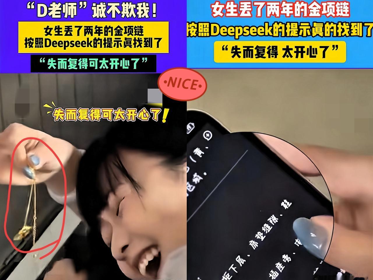 “人工智能立大功!” 山东一女子早在两年前丢了一条金项链, 怎么找都找不到,索幸放弃了, 如今Deepseek上线,女子灵机一动,心想能不能借用“D老师”的智慧,帮忙找一下那条失踪已久的金项链! 结果让人十分意外!网友:“我的身份证就是Deepseek帮忙找到的!” 就像这赵女士,当初把家翻了个底朝天,从衣柜到沙发底,啥地儿都找遍了,还是没找着! 后来看AI帮人找回身份证,她也试试。跟AI描述情况后,按它说的找床垫缝隙,居然真找回了项链! 你说AI为什么这么厉害?其实它就是打破我们平常找东西的固定思路,提醒咱那些想不到的角落! 科技可不只是冷冰冰的代码,它能帮我们找回生活里的小确幸,给我们制造大惊喜。 你们觉得呢?