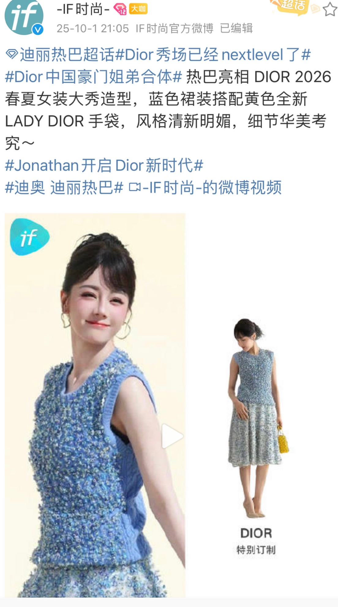 有些人不知道在酸什么,各大杂志时尚博主都认证了这套特别定制,迪丽热巴国内首位Dior by Jonathan Anderson 特别订制