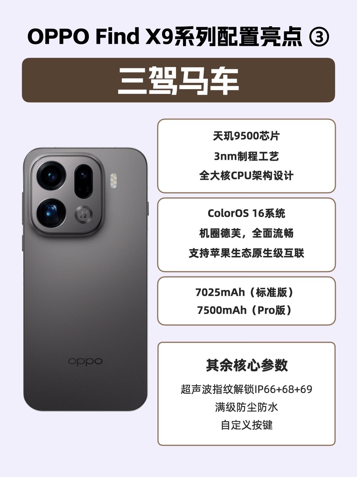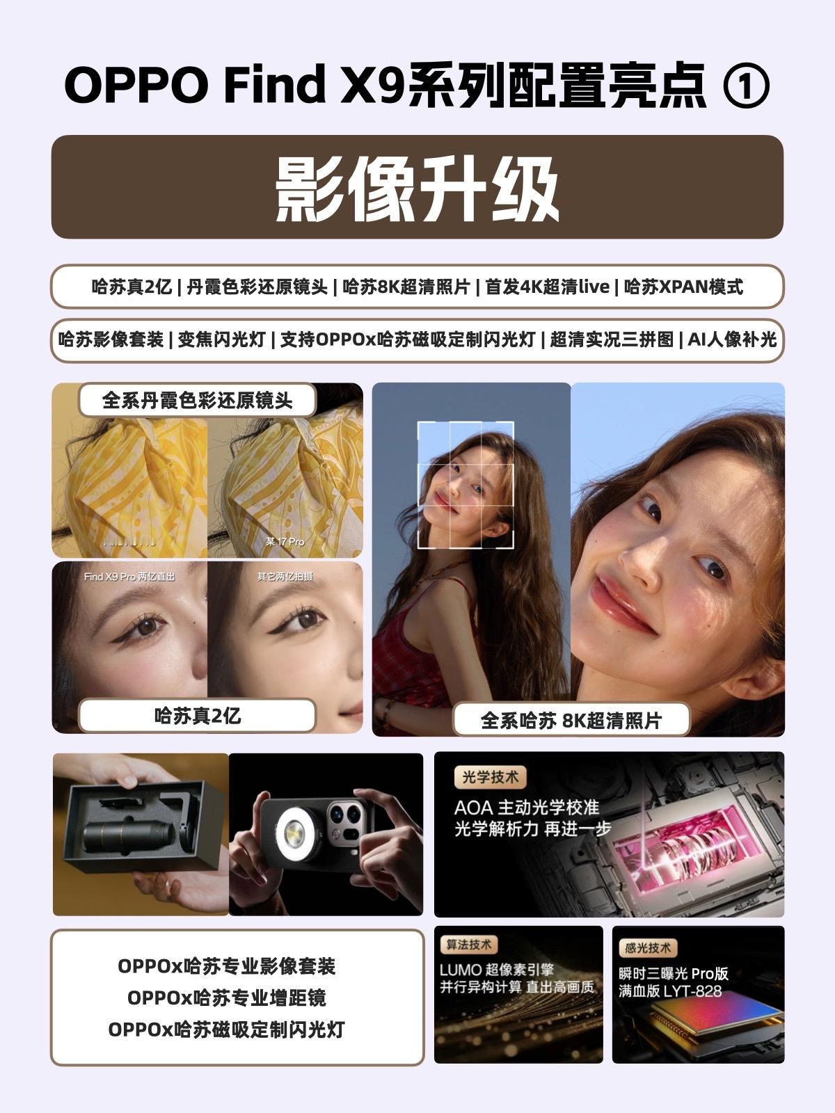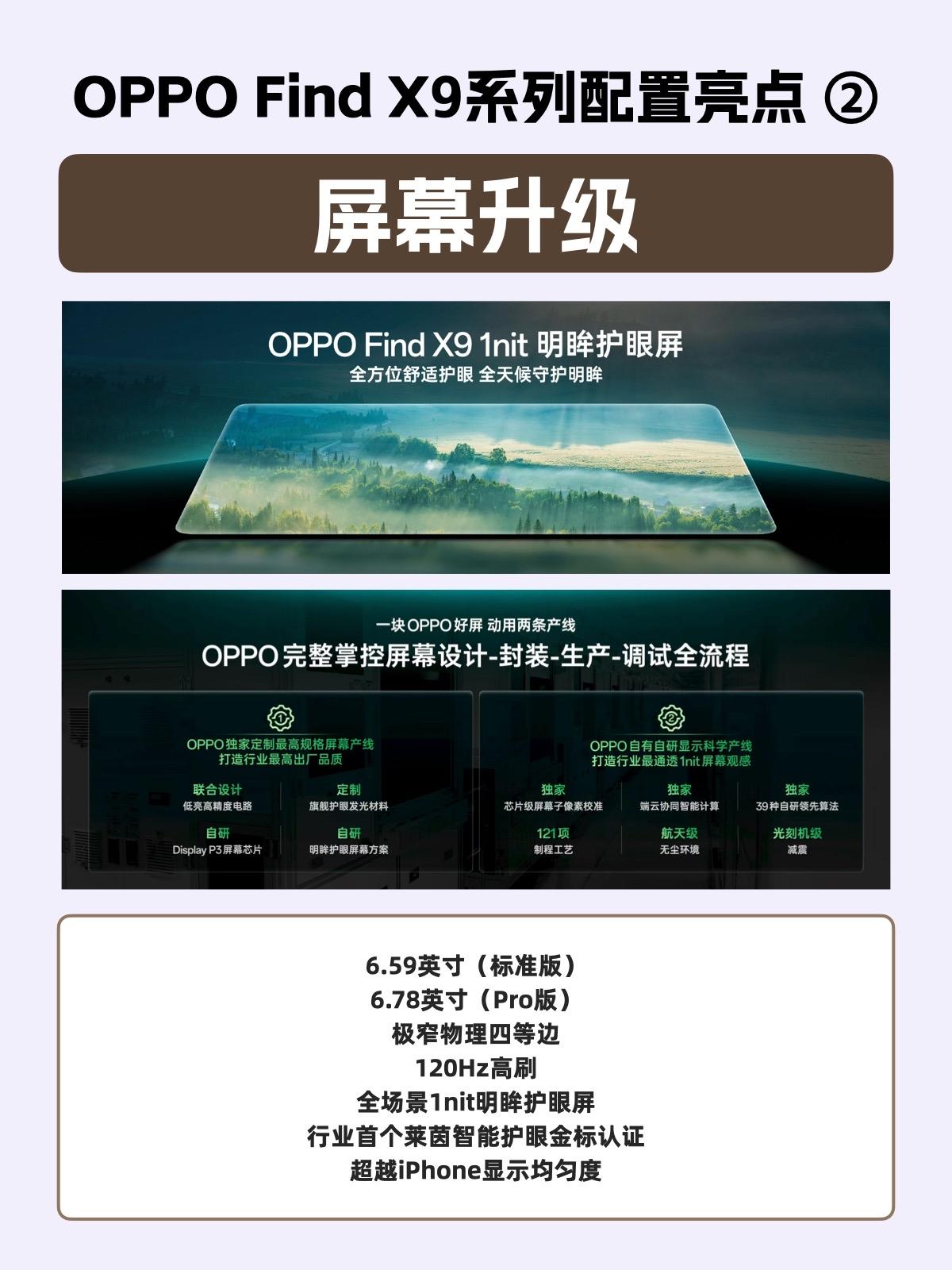 续航+护眼很刚需!年底换手机挑晕了… 国庆放假不想出门人挤人,天天待在家里闲的慌,准备给自己买个礼物,换个新手机📱 简单做了一下功课,发现下半年手机圈真的卷疯了!前有iPhone17、小米17拼刺刀,后有vivo X300系列、OPPO Find X9系列在路上,乍一看真有点难以抉择啊😂 不过我仔细对比了一下,还是Find X9系列比较适合我👇🏻 1️⃣影像实力拉满 软硬件全升级,2亿像素长焦加持,还有哈苏影像套装,望远能力嘎嘎提升!这次还全系都有哈苏人像+丹霞镜头,拍人像肤色自然好看,平时扫街拍咖啡店美食基本直出无压力~ 2️⃣性能三驾马车:全面升级的 ColorOS 16 系统,依然丝滑到底,搭配天玑9500旗舰芯,三大主流游戏做到了 5 小时满帧,真·持久满帧!加上全系破7000大电池,标准版 7025mAh、Pro版 7500mAh,出门一天都能安心浪,对我这种一天满课的大学生太友好了!早上出门到晚上自习都不用借充电宝,边玩游戏边挂网课也不会烫手👍🏻 3️⃣屏幕很戳我!首发1nit明眸护眼屏,据说这块屏在亮度均一性、色彩均一性等等指标都能做到行业TOP1的水准,而且OPPO还带来了新的护眼方案,也是做到了行业内TOP1?天天看手机超过8小时的我很需要😭 看了不少博主汇总,Find X9系列在实用性和颜值上平衡得不错,感觉性价比挺高的😎等10.16价格公布就准备冲了👀 国庆 iPhone17 小米17 OPPO Find X9