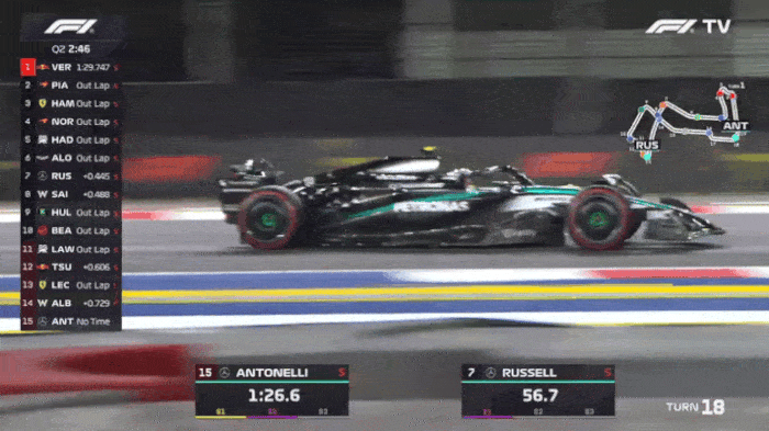 虎扑10月04日讯F1新加坡站排位赛Q2,梅赛德斯车队的安东内利在第一计时段出现严重失误的情况下仍然做出了全场最快单圈。
